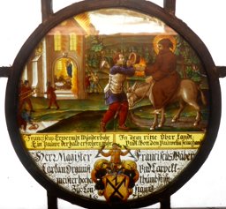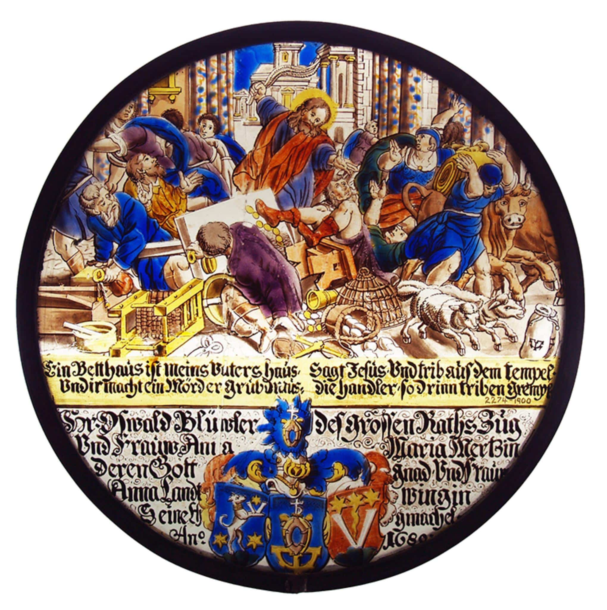 Contrairement aux vitraux dédiés à saint François, conçus probablement pour le cloître des franciscains de Zoug, les deux vitraux historiques représentant le Christ chassant les marchands du temple n’apparaissent pas dans le livre de raison du peintre-verrier zougois Michaël IV Mülller, aujourd’hui conservé au Museum Burg Zug (cf. Boesch 1956b, p. 60-68 ; Bergmann 2004a, p. 129-145).
