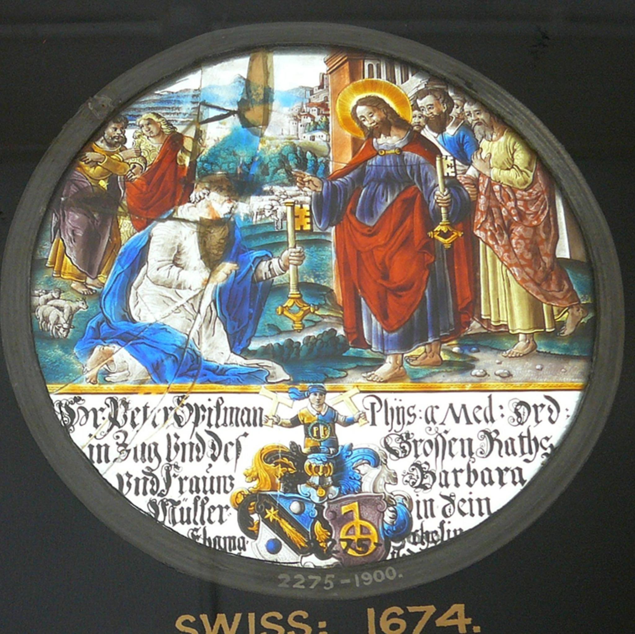 Vitrail historié aux armes de Peter Spillmann et Barbara Müller : la remise des clés à saint Pierre