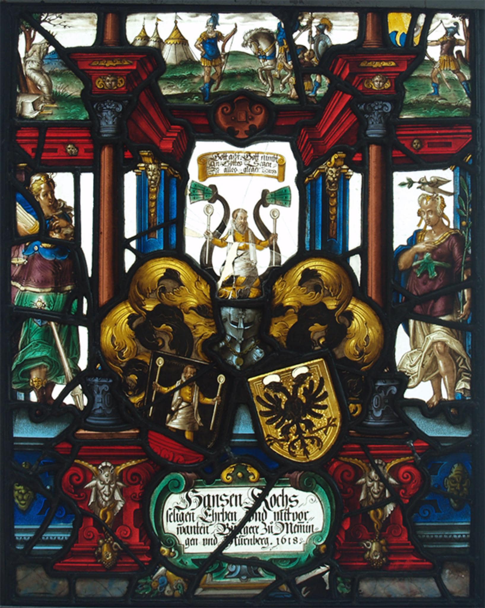 Le donateur, Hans Koch, n’a pas pu être identifié avec certitude. Dans l’ancienne Confédération, il existe une branche des Koch, documentée à Berne, qui proviendrait de Lüen (GR) et qui partage des armoiries semblables mais pour laquelle il est difficile d’établir un lien avec les villes allemandes de Memmingen et de Nuremberg, cités dans le panneau de Londres. Il existe cependant un Hanns II Koch, fils de Hans I Koch et de Regina Haym, qui naquit en 1575 et mourut en 1654 à Memmingen, dont il fut bourgmestre de la ville. Il était le frère cadet de Johann Matthias Koch qui, devenu l’un des plus riches marchands d’Augsbourg, prit le patronyme de Koch von Gailenbach après avoir acquit le château éponyme dans les années 1660. Cette seconde identification paraît plus probable, bien que l’emplacement d’origine de ce vitrail n’est pas établi.