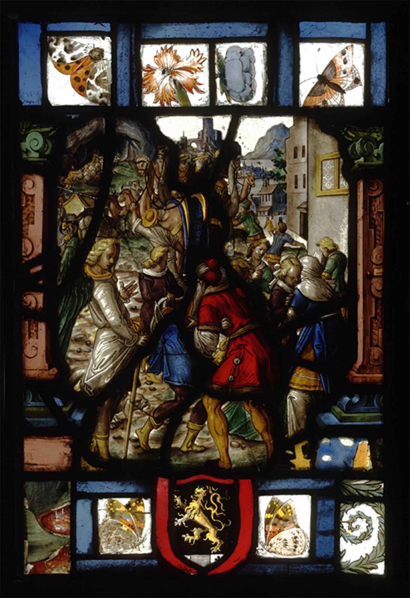 Vitrail historié aux armes absentes : le retour de Tobie chez son père Tobit
