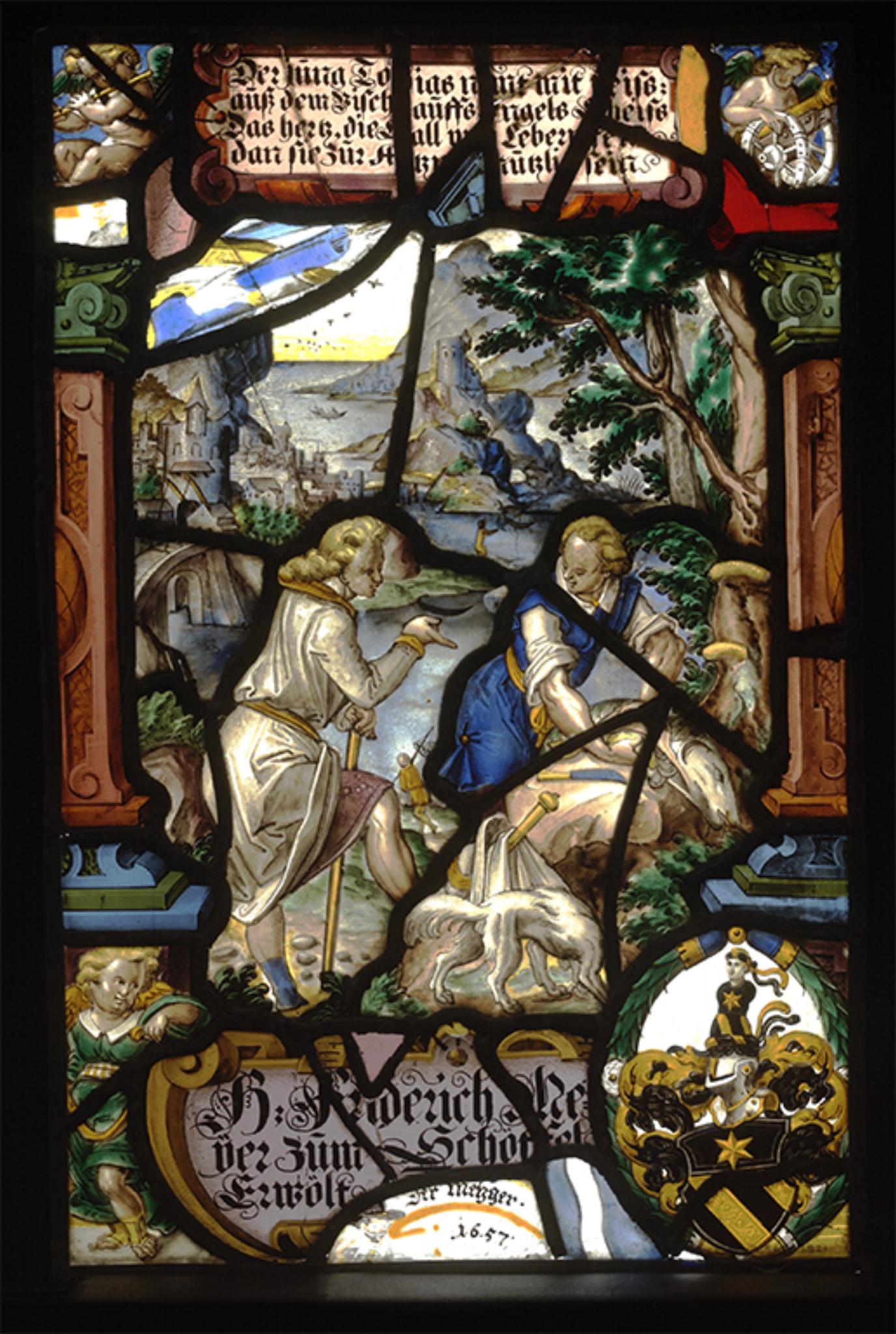 De grande qualité, ce vitrail, dont l’état de conservation est moyen, représente une scène vétérotestamentaire tirée du Livre de Tobie, à savoir, Tobie au bord du fleuve Tigre qui, accompagné d’un chien et de l’ange Raphaël, saisit et éventre un poisson dont il récupère le fiel, le coeur et le foie, sur conseil de l’ange (Tb 6, 1-5). Il fait partie d’une série de vitraux historiés qui retracent l’histoire de Tobie et qui furent commandés par la corporation strasbourgeoise „Schöffel“, dont 10 sont conservés au Victoria & Albert Museum (VAM, inv. C.560 à 569-1921 – cf. Rackham 1936, p. 94).