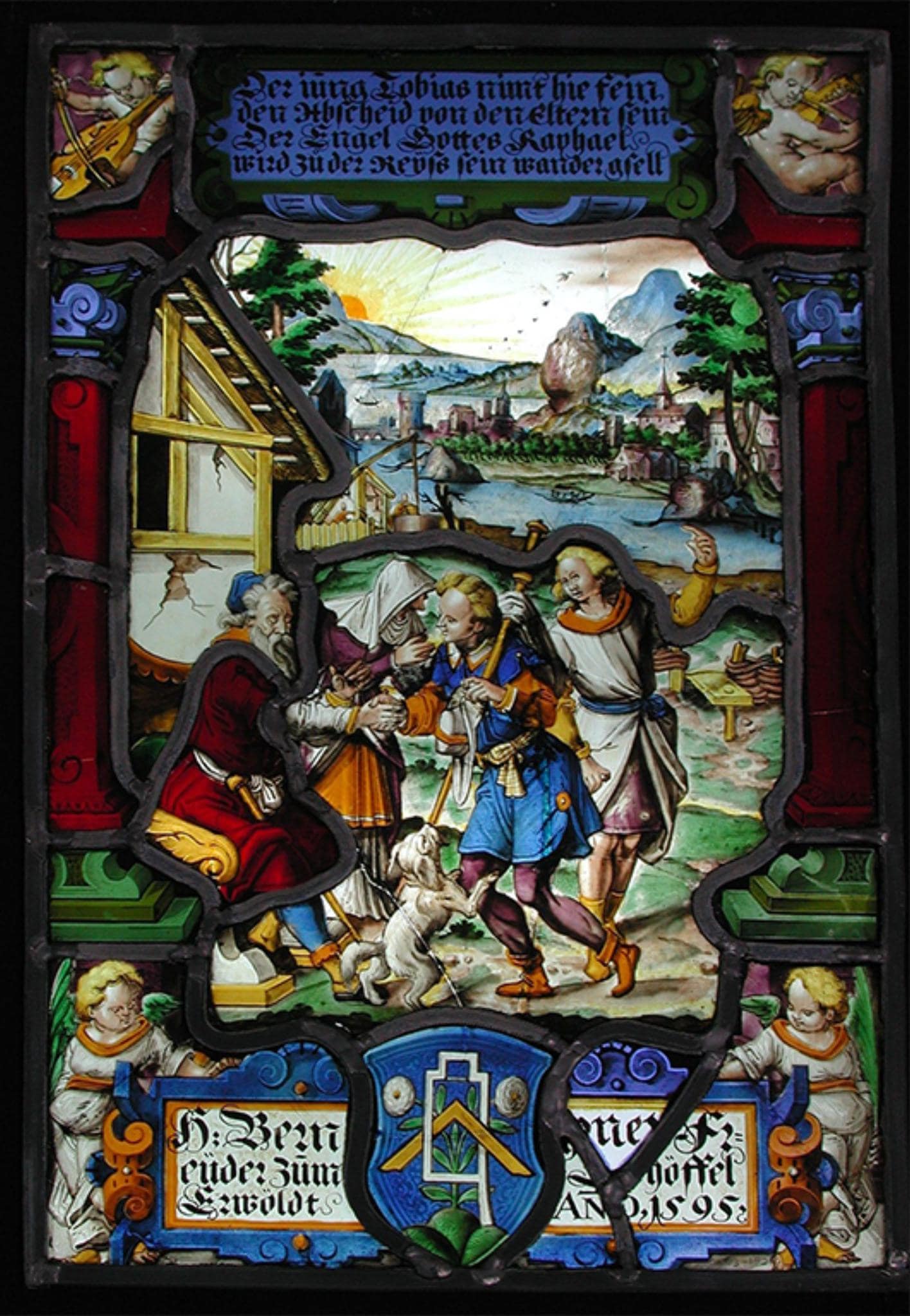 De grande qualité, ce vitrail, dont l’état de conservation est bon, représente une scène vétérotestamentaire tirée du Livre de Tobie, à savoir Tobie qui, accompagné de l’ange Raphaël, prend congé de ses parents (Tb 5, 9-23). Il fait partie d’une série de vitraux historiés qui retracent l’histoire de Tobie et qui furent commandés par la corporation strasbourgeoise „Zum Schöffel“, dont 10 sont conservés au Victoria & Albert Museum (V&A, inv. C.560 à 569-1921 – cf. Rackham 1936, p. 94).