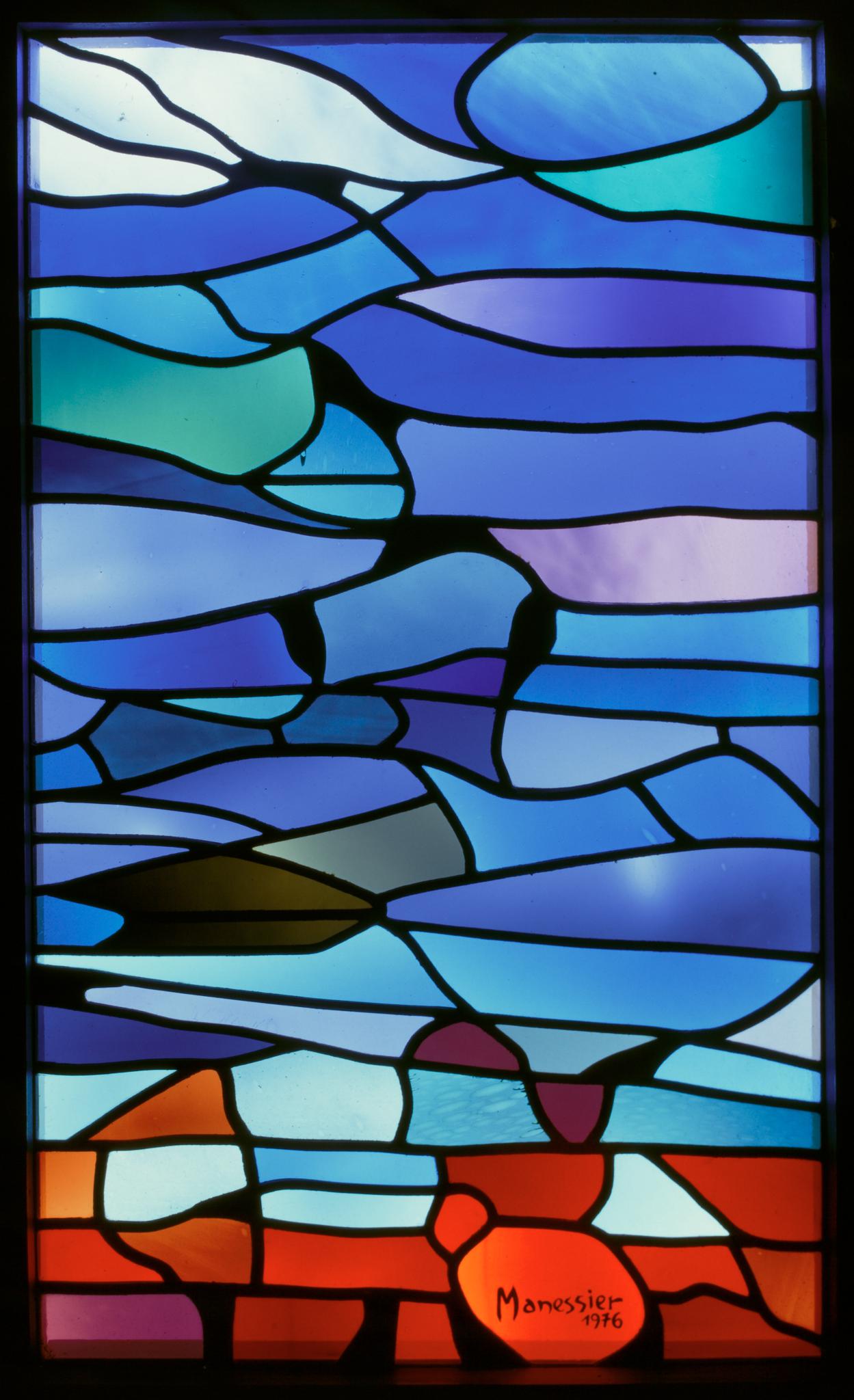 Bei dieser Scheibe handelt es sich um ein Probefeld für das grosse Fenster, das der französische Künstler Alfred Manessier 1976 für die Heiliggrabkapelle der Kathedrale von Fribourg geschaffen hat. Wer diese um 1430 entstandene Kapelle besucht, ist unweigerlich beeindruckt von der Farbentiefe und der Wirkung von Manessiers Werk und dem hervorragenden Zusammenspiel von moderner, abstrakter Glaskunst mit der aus dem ausgehenden Mittelalter stammenden monumentalen Grablegungsgruppe.