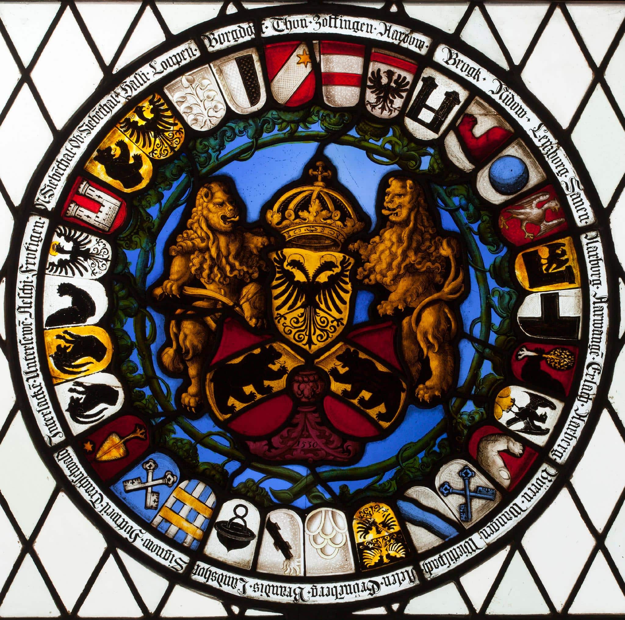Wappen Bern: In Rot goldener Schrägbalken, belegt mit einem schwarzen Bären. Reichswappen: In Gold schwarzer Doppeladler mit goldenem Nimbus. Wappen Thun: In Rot silberner Schrägbalken, oben belegt mit goldenem sechsstrahligem Stern. Wappen Zofingen: Dreimal geteilt von Rot und Silber. Wappen Aarau: In Silber mit rotem Schildhaupt schwarzer Adler. Wappen Brugg: In Silber schwarzer Brückenkopf. Wappen Nidau: In Silber aus linkem Schildrand wachsende rote Bärentatze. Wappen Lenzburg: In Silber blaue Kugel. Wappen Saanen: In Rot flugbereiter silberner und goldbewehrter Kranich. Wappen Aarburg: In Gold schwarze Burg mit schwarzem Adler. Wappen Aarwangen: Gespalten von Silber mit schwarzem Balken und von Schwarz. Wappen Erlach: In Rot aus linkem Schildrand wachsende schwarze Bärentatze, eine ausgerissene goldene Erle haltend. Wappen Aarberg: In Silber auf goldenem Dreiberg flugbereiter schwarzer Adler. Wappen Büren: In Rot aus linkem Schildrand wachsende silberne Bärentatze. Wappen Wangen: In Silber zwei gekreuzte blaue Schlüssel. Wappen Wiedlisbach: In Silber blauer Schrägfluss. Wappen Aigle: Geteilt von Schwarz und Gold mit je einem Adler in verwechselten Farben. Wappen Grünenberg: In Silber silberner (eigentlich grüner und gelbgeränderter) Sechsberg. Wappen Brandis: In Silber schwarzer Brand. Wappen Landshut: In Silber schwarzer Eisenhut mit ebensolchem Sturmband. Wappen Signau: Fünfmal von Blau und Silber gespalten, darüber zwei goldene Balken. Wappen Huttwil: In Blau zwei gekreuzte silberne Schlüssel. Wappen Trachselwald: In Rot ausgerissene goldene Tanne, oben links begleitet von sechsstrahligem goldenem Stern. Wappen Interlaken: In Silber halber schwarzer Steinbock. Wappen Unterseen: In Gold halber schwarzer Steinbock. Wappen Aeschi: In Silber aus rechtem Schildrand wachsende schwarze Bärentatze. Wappen Frutigen: In Silber schwarzer Adler mit goldenem Nimbus. Wappen Niedersimmental: In Rot zweitürmige silberne Burg. Wappen Obersimmental: In Gold halber schwarzer Bär. Wappen Hasli: In Gold schwarzer Adler. Wappen Laupen: In Silber ausgerissene silberne (eigentlich goldene) Linde mit sieben Blättern. Wappen Burgdorf: Gespalten von Silber und Schwarz mit silbernem (eigentlich goldenem) Schildrand.
