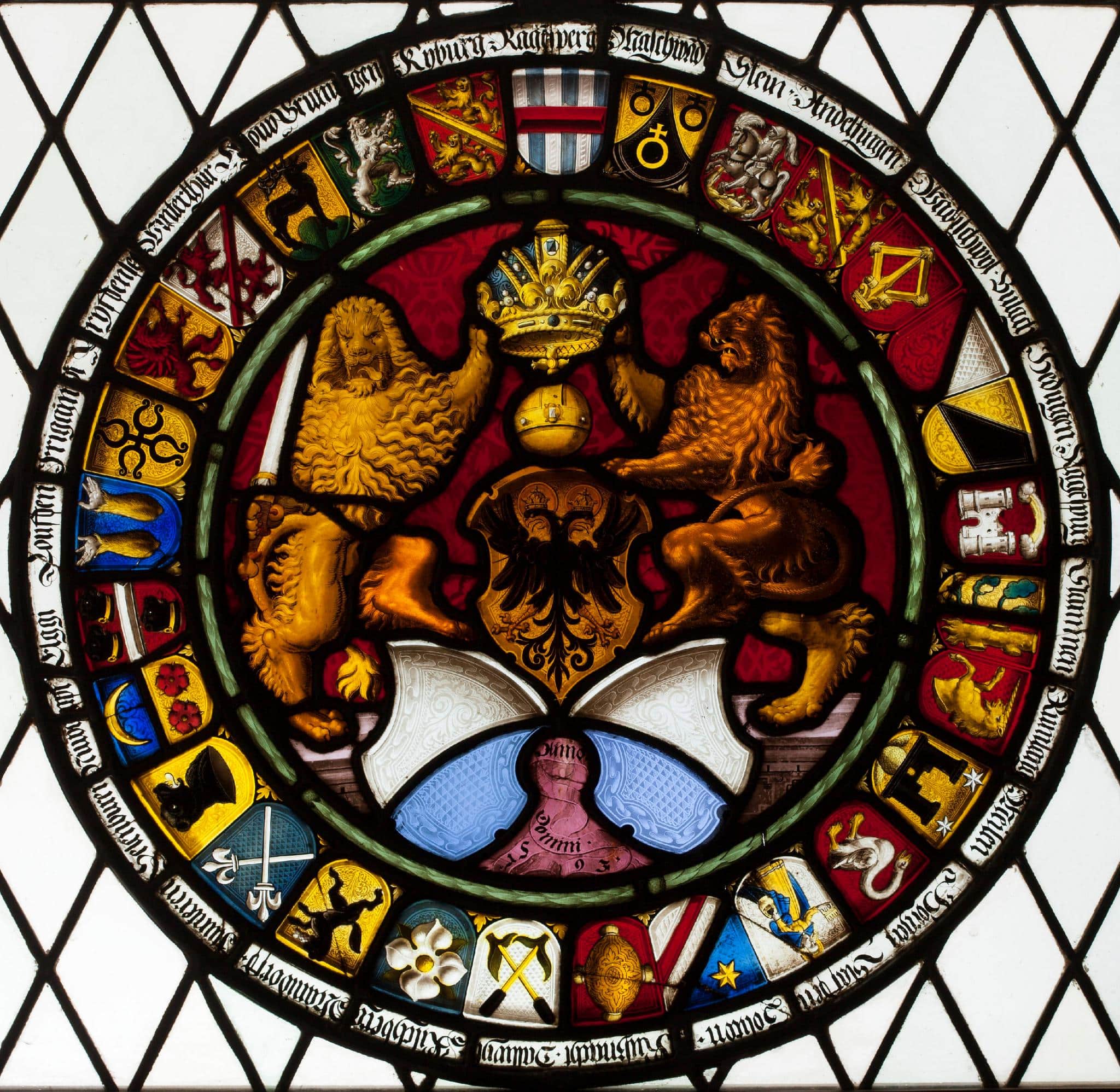Wappen Zürich: Schräggeteilt von Silber und Blau. Reichswappen: In Gold goldbewehrter und goldnimbierter schwarzer Doppeladler. Wappen Regensdorf: In Silber drei blaue Pfähle, belegt mit rotem Balken (mit der originalen üblichen «falschen» Beschriftung: Regensberg). Wappen Maschwanden: In Gold geschweifte schwarze Spitze, belegt und beseitet mit drei Planetenzeichen Erde in verwechselten Farben. Wappen Stein am Rhein: In Rot hl. Georg in silberner Rüstung auf silbernem Pferd über den silbernen Drachen reitend. Wappen Andelfingen: In Rot goldener Schrägbalken, begleitet von zwei schreitenden goldenen Löwen, der untere überhöht von goldenem Stern. Wappen Wädenswil: In Rot goldene Schnalle. Wappen Bülach: Schrägrechts geteilt von Silber und Rot. Wappen Hedingen: In Gold schrägrechte gestürzte schwarze Spitze. Wappen Regensberg: In Rot silberne Burg, überhöht von einem auf silbernen Wolken fussenden Regenbogen (mit der originalen üblichen "falschen" Beschriftung: Regensburg). Wappen Stammheim: Gespalten, links in Rot ein goldener Stamm, rechts in Gold ein halber ausgerissener Zweig mit drei grünen Blättern. Wappen Rümlang: In Rot halbes goldenes Einhorn. Wappen Meilen: In Gold über silbernem Dreiberg zweitürmige schwarze Burg, überhöht von zwei silbernen Sternen. Wappen Horgen: In Rot silberner goldbewehrter Schwan. Wappen Stäfa: In Silber die goldnimbierte hl. Verena in goldenem Kleid und blauem Mantel, in der Rechten einen goldenen Kamm, in der Linken einen goldenen Korb haltend. Wappen Zollikon: Schrägrechts geteilt von Blau mit goldenem Stern und von Silber mit rotem Schrägbalken. Wappen Küssnacht: In Rot ein übereckgestelltes goldenes Kissen. Wappen Thalwil: In Silber zwei gekreuzte schwarze Rohrkolben mit goldenen Stielen und grünen Blättern. Wappen Kilchberg: In Blau silberne, goldbebutzte vierblättrige Rose. Wappen Männedorf: In Gold steigender schwarzer Fischotter, im Maul silbernen Fisch haltend. Wappen Fluntern: In Blau zwei gekreuzte silberne Zepter. Wappen Sellenbüren: In Gold schwarzer Bärenkopf. Wappen Neuamt: Geteilt von Blau mit gestürztem goldenem Halbmond und von Gold mit zwei roten goldbebutzten Rosen. Wappen Elgg: In Rot mit silberner Binde drei goldbewehrte schwarze Bärenhäupter (2, 1). Wappen Laufen: In Blau zwei nach oben gerichtete, behaarte bzw. fellbesetzte hellbraune Arme. Wappen Freiamt: In Gold kreuzförmiger schwarzer Schildbeschlag. Wappen Greifensee: In Gold steigender roter Greif. Wappen Winterthur: In Silber roter Schrägbalken, begleitet von zwei schreitenden roten Löwen. Wappen Eglisau: In Gold über grünem Dreiberg stehender schwarzer Hirsch. Wappen Grüningen: In Grün steigender silberner Löwe. Wappen Kyburg: In Rot goldener Schrägbalken, begleitet von zwei schreitenden goldenen Löwen.