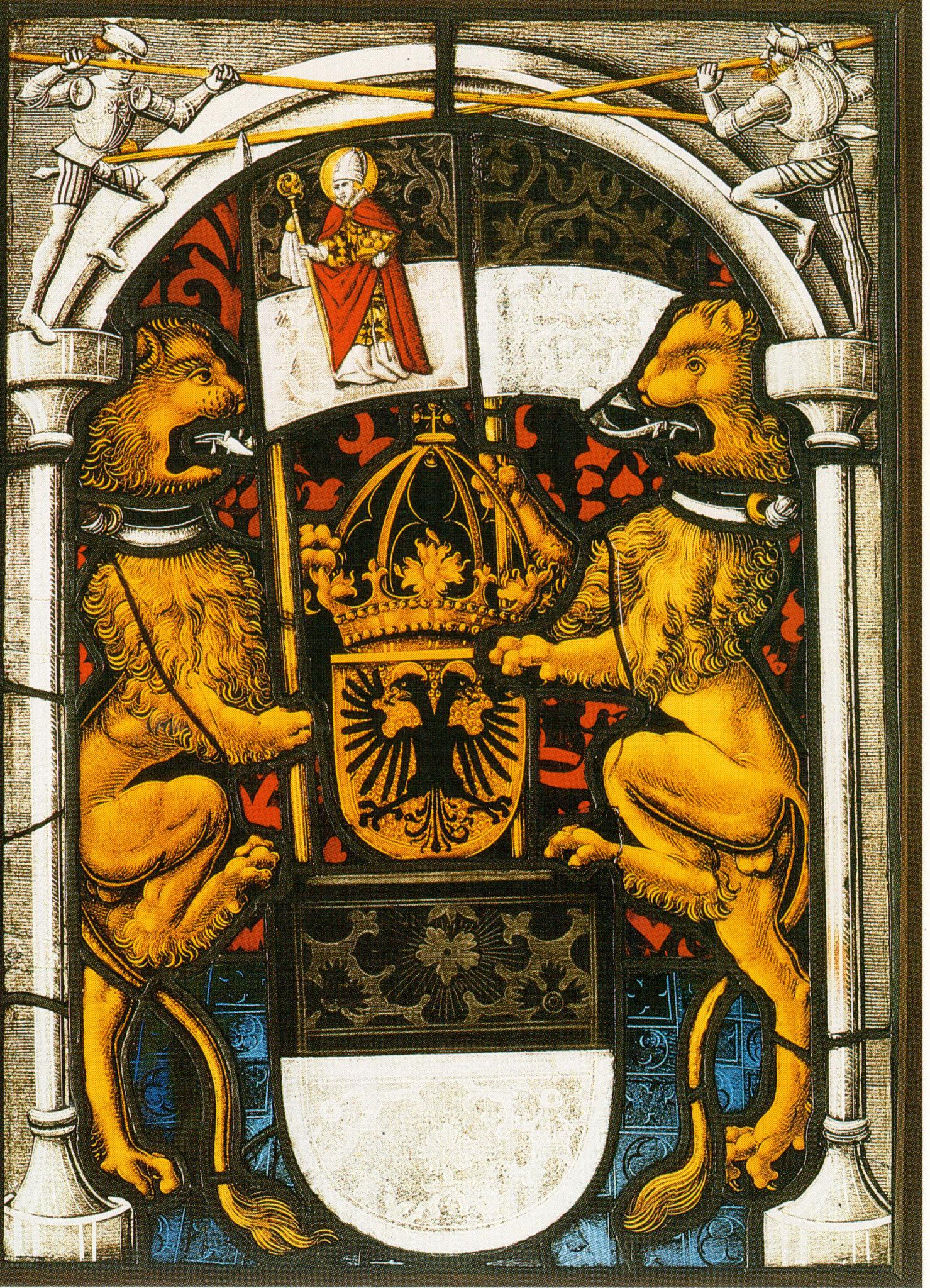 Wappen Freiburg: Geteilt von Schwarz und Silber. Reichswappen: In Gold schwarzer goldnimbierter Doppeladler.