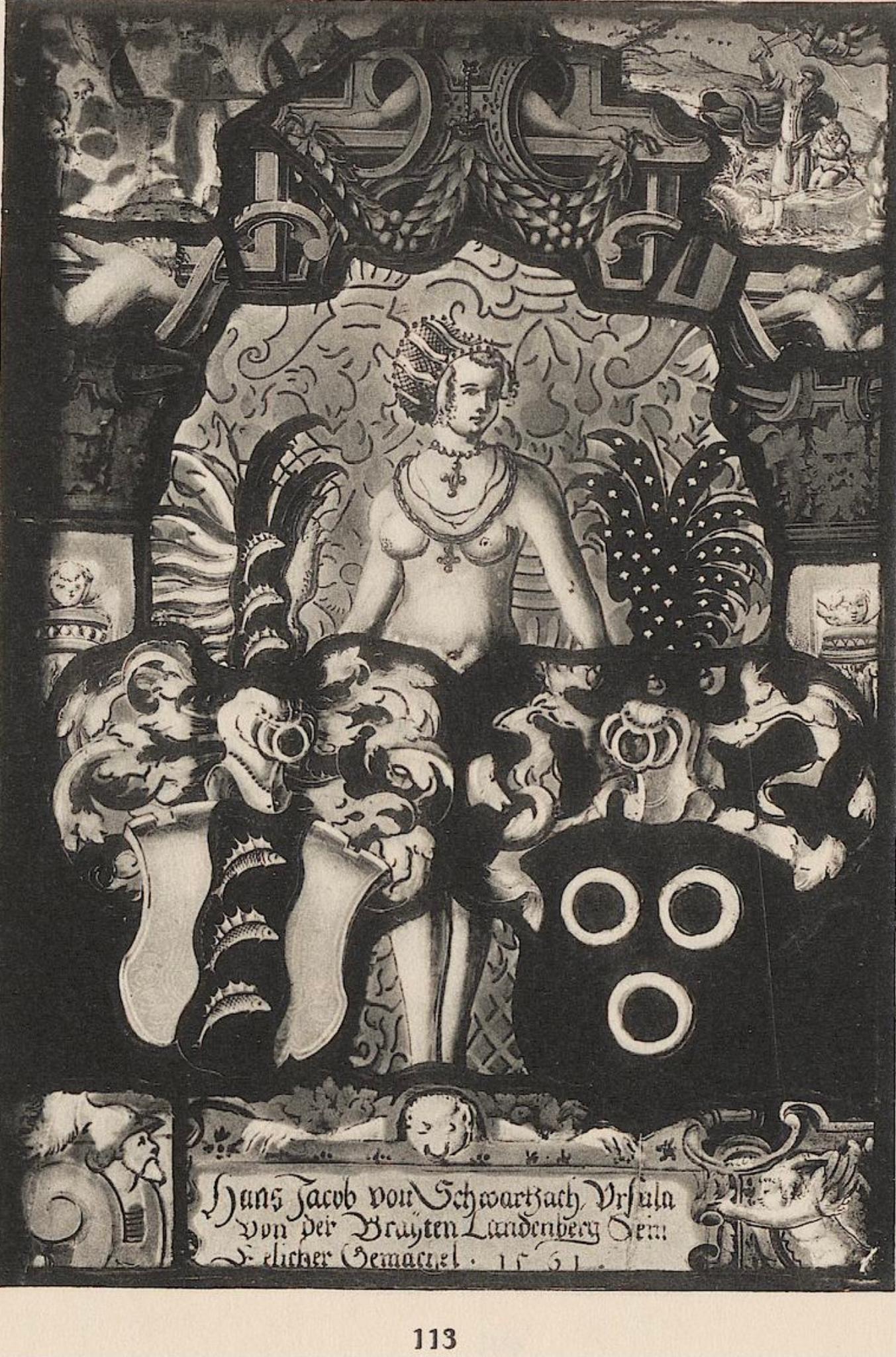 Die Schwarzach waren eine aus Schaffhausen gebürtige Patrizierfamilie, von deren Angehörigen viele in Konstanz ihren Wohnsitz hatten. Der Stifter der Scheibe und seine Frau sind schlecht dokumentiert, weiss man doch lediglich, dass Ursula von Breitenlandenberg, die im "Vischgrätli" ob Kreuzlingen wohnhafte Gemahlin des Hans Jakob von Schwarzach, 1584 als Witwe den Freisitz Thurberg bei Weinfelden in Besitz nahm (Trösch 2012, S. 265).