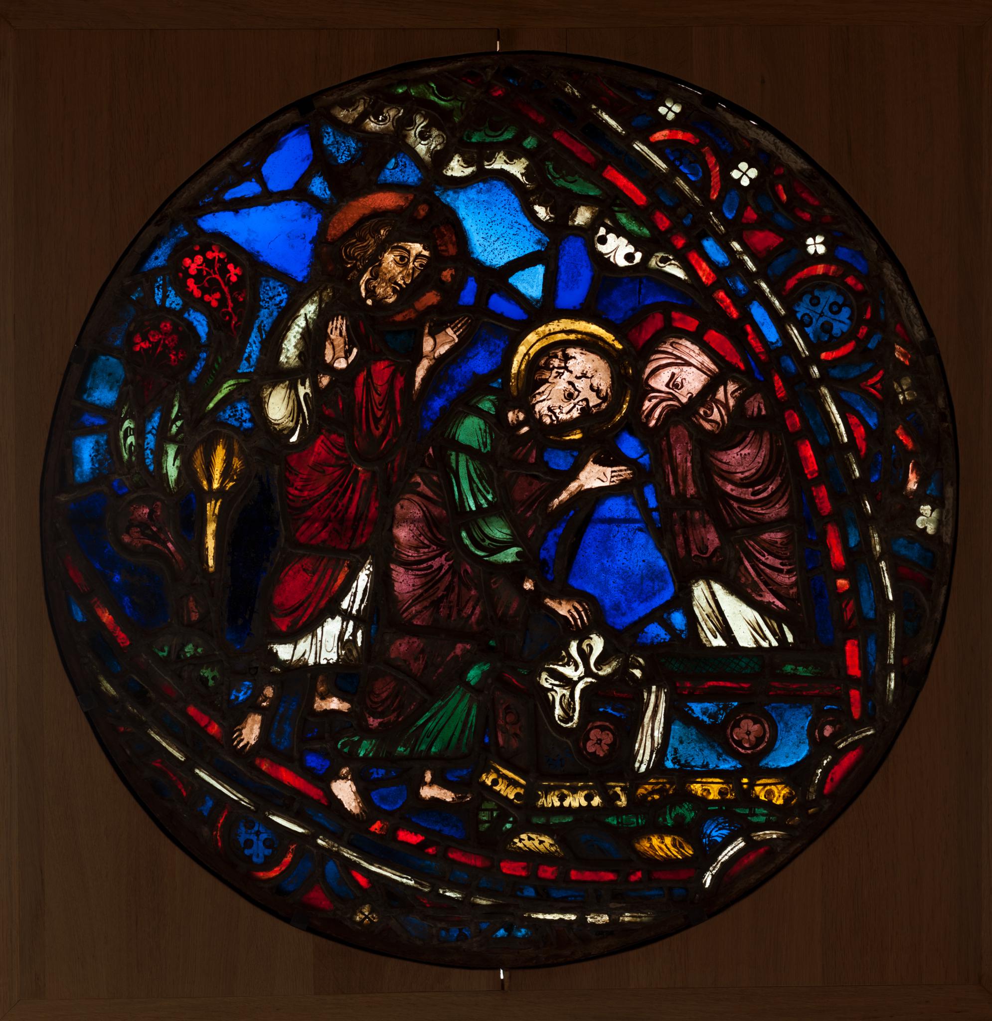 Ce vitrail a bénéficié de plusieurs études, dont les plus importantes sont celle de Sandra Fiechter (1991) et celle de Brigitte Kurmann-Schwarz (2000). Comme son pendant conservé au Musée historique de Bâle, il provient de la cathédrale Notre-Dame de Chartres, en Eure-et-Loir, située à environ 90 kilomètres au sud-est de Paris. Il est considéré de la première campagne de vitrage de la cathédrale, datée entre 1194 et 1240 (cf. Delaporte, 1926 ; Grodecki, 1981 ; Fiechter, 1991, p. 28 ; Kurmann-Schwarz, 2000, p. 266). Avec son pendant et un panneau représentant le martyre de saint Georges conservé au Princeton University Art Museum (Princeton, Princeton University Art Museum, inv. y71 – ce dernier cependant fortement remanié), ces trois panneaux compteraient parmi les rares vitraux de Chartres ayant atterri sur le marché de l’art.