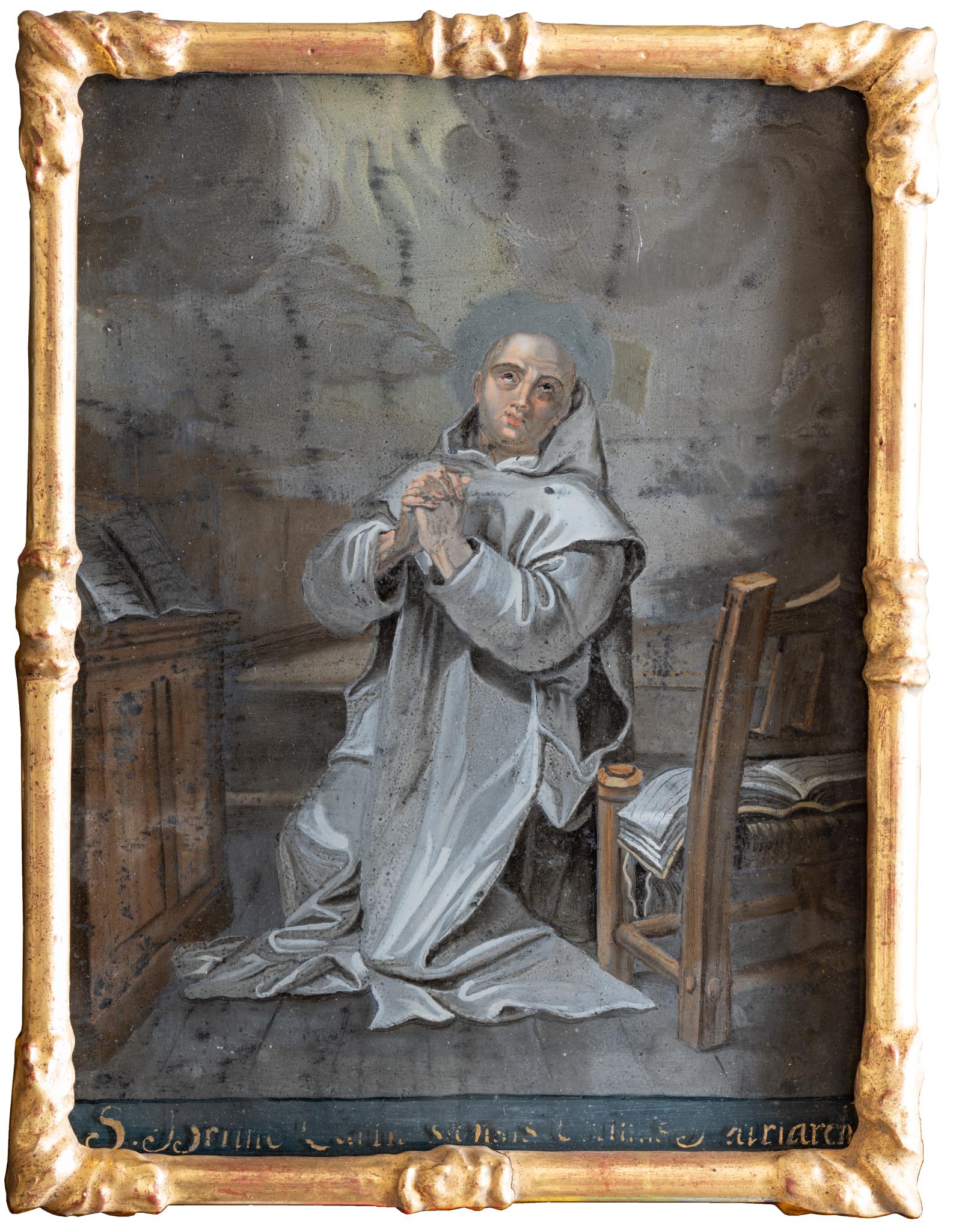 Der heilige Bruno kniet im Gebet vor einem hölzernen Betpult. Darauf ist ein geöffnetes Buch zu sehen. Zu seiner Linken ist ein Stuhl dargestellt, darauf befindet sich ein weiteres aufgeschlagenes Buch. Die Augen des Heiligen sind nach oben gerichtet; von oben scheinen helle Strahlen auf ihn hinunter.