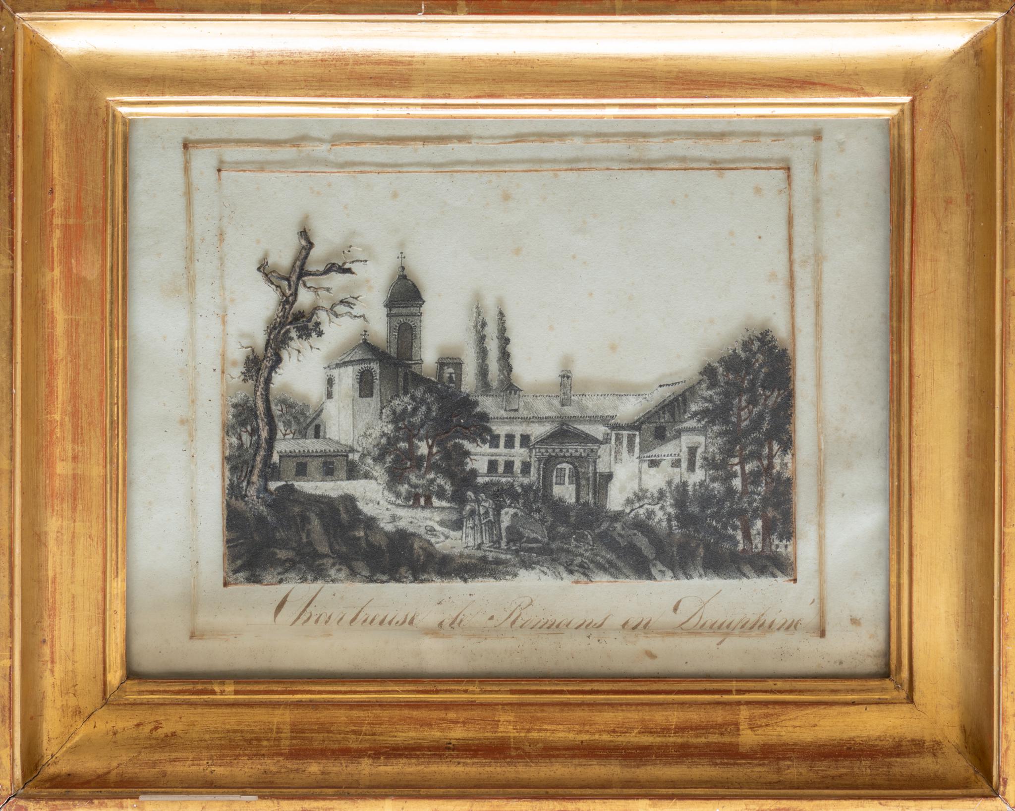 Dargestellt ist die Ansicht einer Klosteranlage. Es handelt sich um das ehemalige Kartäuserkloster von Romans-sur-Isère. Links befindet sich die Klosterkirche, die Szenerie ist eingerahmt von Bäumen. Im Vordergrund sind zwei Nonnen zu sehen, die in Richtung der Kirche gehen.