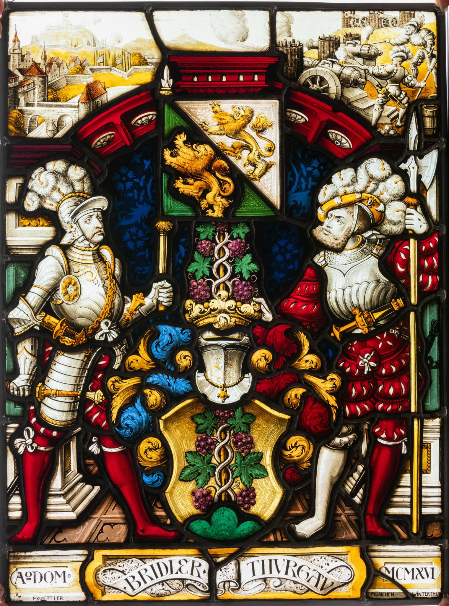 Die Bridler sind eine alte Beamten- und Ärztefamilie von Müllheim und Bischofszell (vgl. TG_487). Die gleiche Provenienz und Grösse sowie die ähnliche Komposition lassen darauf schliessen, dass diese Wappenscheibe sowie die Kopie der Stadtscheibe von Stein am Rhein (vgl. TG_307) aus demselben Zusammenhang stammen.