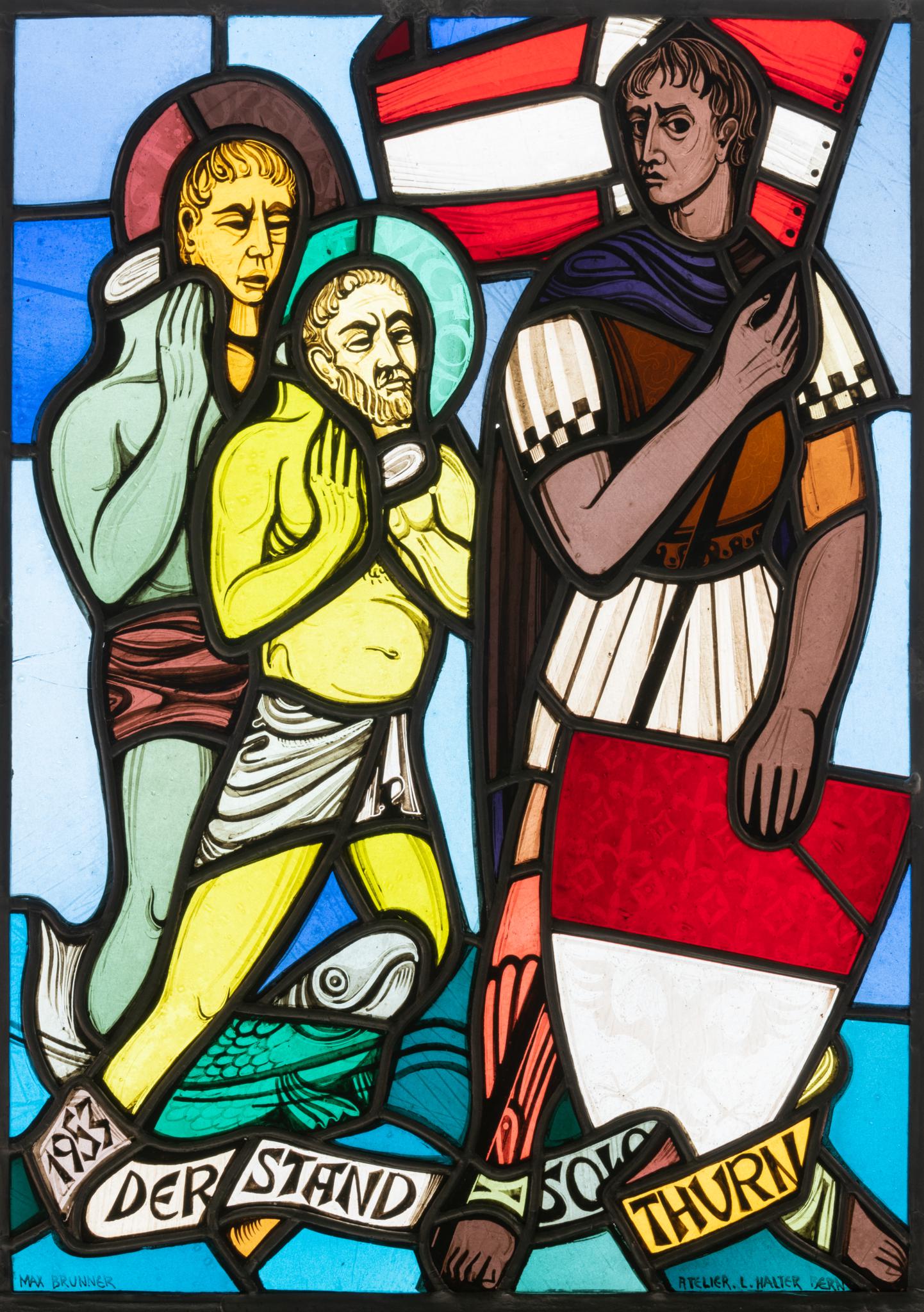 Auf dem Glasgemälde sind drei männliche Figuren zu sehen. Die Patrone Solothurns, die Heiligen Viktor und Ursus, tragen einfache Lendenschürzen an ihrem gelben bzw. grünen Körper. Ihre Häupter halten sie jeweils mit beiden Händen vor sich. Zwischen ihren Beinen befindet sich ein Fisch und durch blaue Farbe sowie Wellen im unteren Bereich der Scheibe ist ein Gewässer angedeutet.