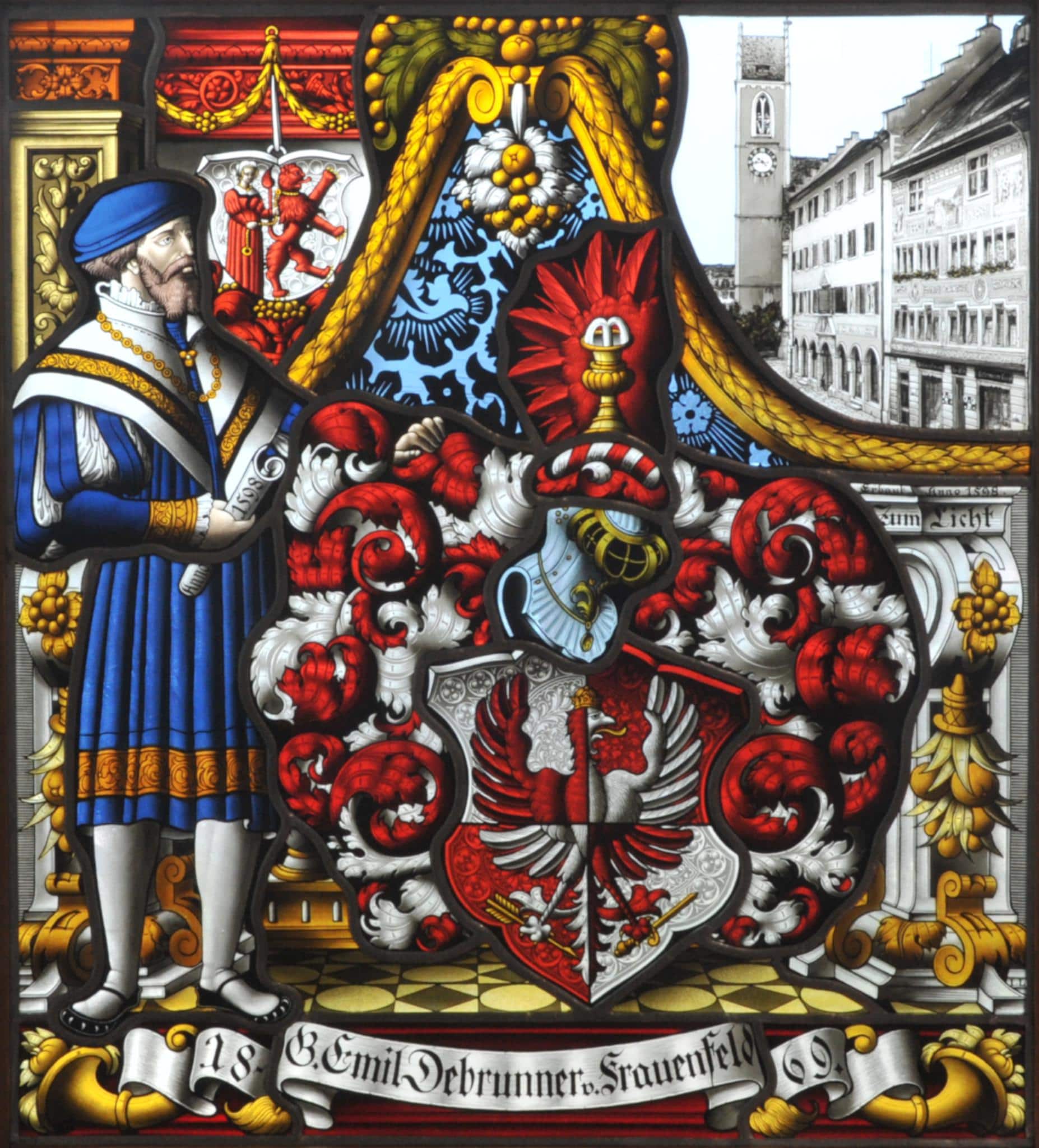 Leicht hochrechteckige Scheibe, die das Vollwappen Debrunners zeigt, darunter die Inschrift. Dargestellt ist eine männliche Figur mit einer Schriftrolle in der rechten Hand, darüber das Frauenfelder Wappen. Rechts oben ist die Evangelische Stadtkirche, das Haus zum Licht (Freie-Strasse 4) und das gleich daneben befindliche Haus zum Schwert (Freie-Strasse 6–8) zu sehen.