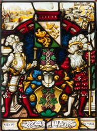 Vor grün-schwarzem Damastgrund stehen sich zwei Landsknechte mit Halbarten sowie Dolch bzw. Schwert als Schildhalter für das Wappen von Stein am Rhein auf roten Kacheln gegenüber. Der linke Landsknecht ist mit einer geschlitzten weiss-roten Tracht mit weissen Beinkleidern bekleidet, der rechte trägt einen silbernen Halbharnisch mit gelb-schwarzem Beinkleid. Über dem Georgenwappen folgt das Stadtwappen mitsamt gespiegeltem Abbild, darüber das bekrönte Reichswappen. Zwei rote Säulen mit blauen Kapitellen tragen einen roten Flachbogen. Darüber im Oberbild Schlachtszenen. Unten befindet sich das Schriftband mit der Jahreszahl, seitlich davon zwei Szenen der Geschichte Jakobs: links die Leiter, rechts das Opfer.