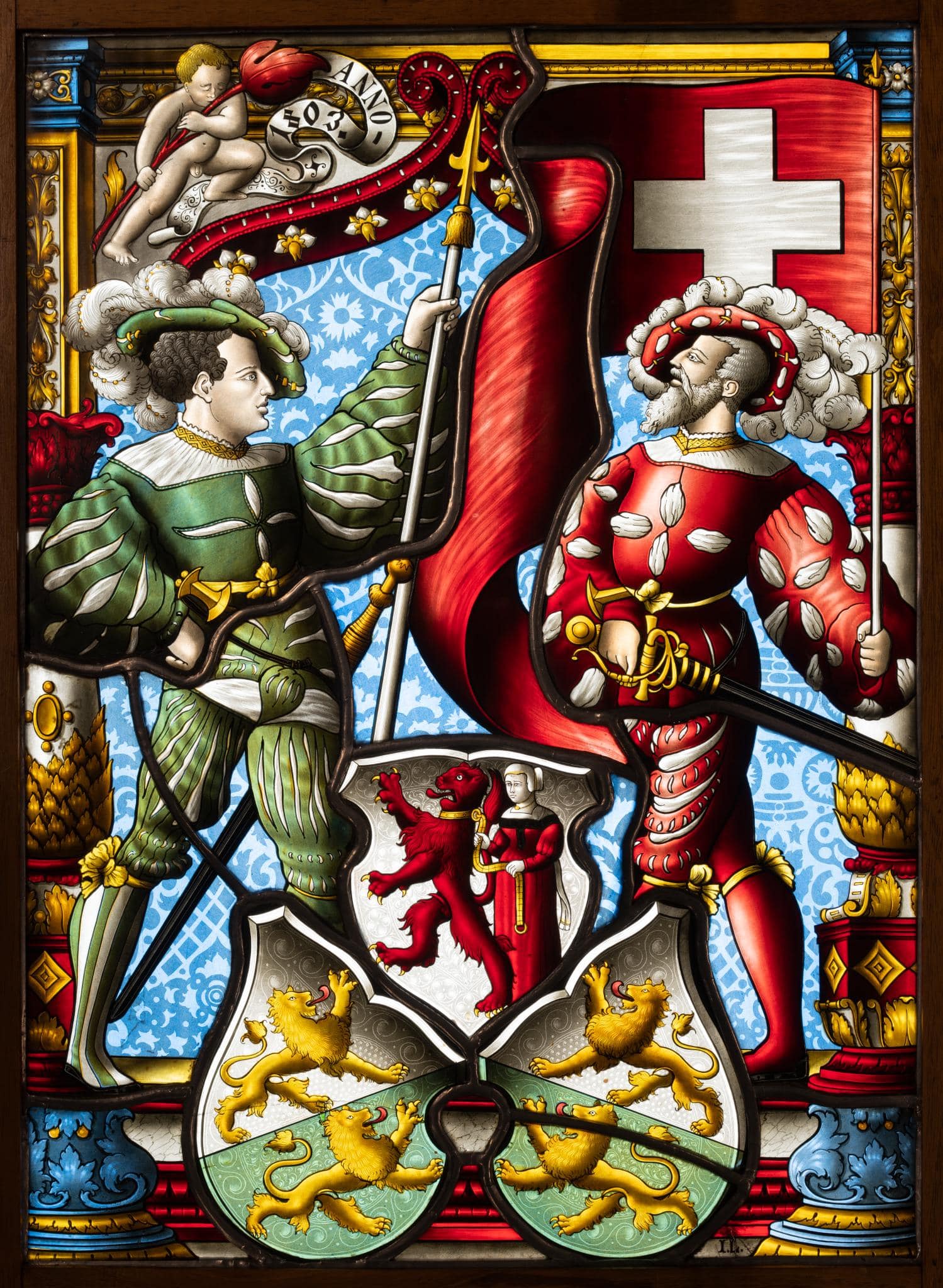 Vor blauem Damastgrund und einem Podest mit weissem marmoriertem Boden und roter Kante ist das Thurgauer Wappen zwei mal (gegenständig) zu sehen, darüber das Frauenfelder Wappen. Als Schildhalter stehen sich ein Landsknecht links und ein Bannerträger rechts gegenüber, die jeweils mit Schwertern bewaffnet sind. Der Landsknecht ist bekleidet mit grün-weiss geschlitzter Tracht und hält eine Lanze in seiner linken Hand. Der Bannerträger mit einer rot-weiss geschlitzten Tracht hält in seiner ebenfalls linken Hand das Schweizer Banner und seine Rechte ruht auf dem Schwertgriff. Auf mehrfarbigen und mehrteiligen Pfeilern ruht ein golden-weisses Gebälk.