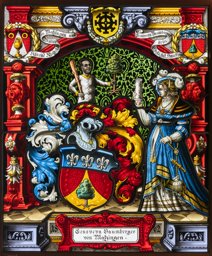 Wappen Ringold, Konrad: In Rot begleitet von zwei goldenen Ringen silberne aufsteigende Spitze mit goldener Vase; auf dem silbernen mit schwarzem Futter ausgeschlagenem Spangenhelm mit goldenen Spangen, rot-goldener Decke und goldenem Halskleinod ein wachsender Junker mit rotverzierter goldener Kleidung und je einem goldenen Ring in den Händen.