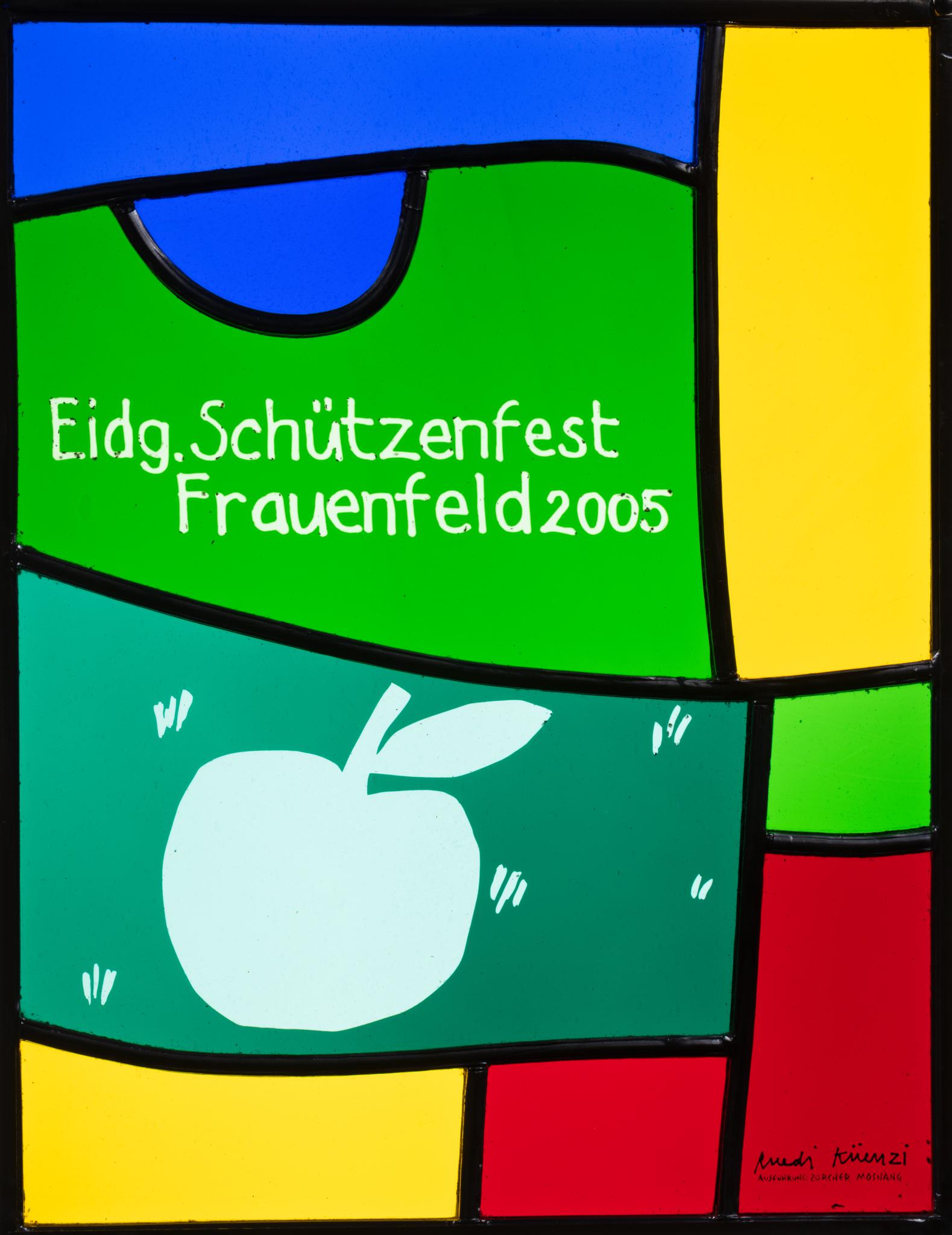 Die rechteckige Scheibe ist aus verschiedenfarbigen Glasstücken in unterschiedlicher Form zusammengesetzt. Auf dem grossen grünen Glas der unteren Hälfte ist als einziger figurativer Inhalt ein Apfel aufgebracht. Darüber ist die Inschrift zu lesen.