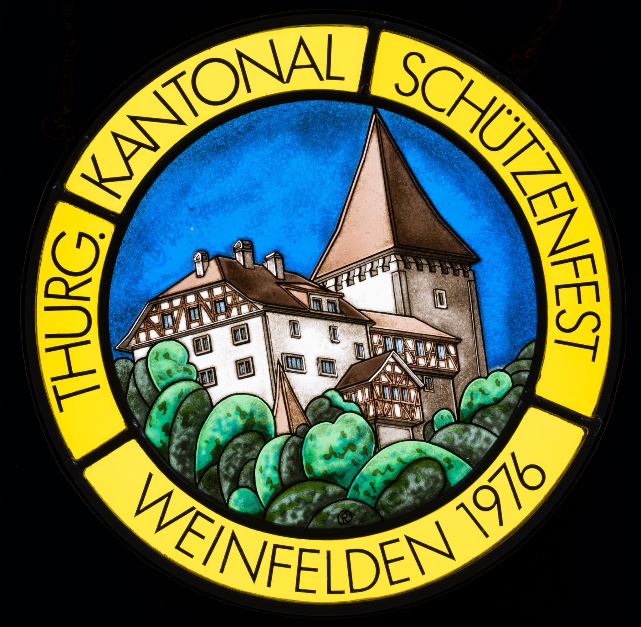Runde Scheibe mit einer gelben Bordüre mit Inschrift. Im Bildfeld die Darstellung des Schlosses Weinfelden.