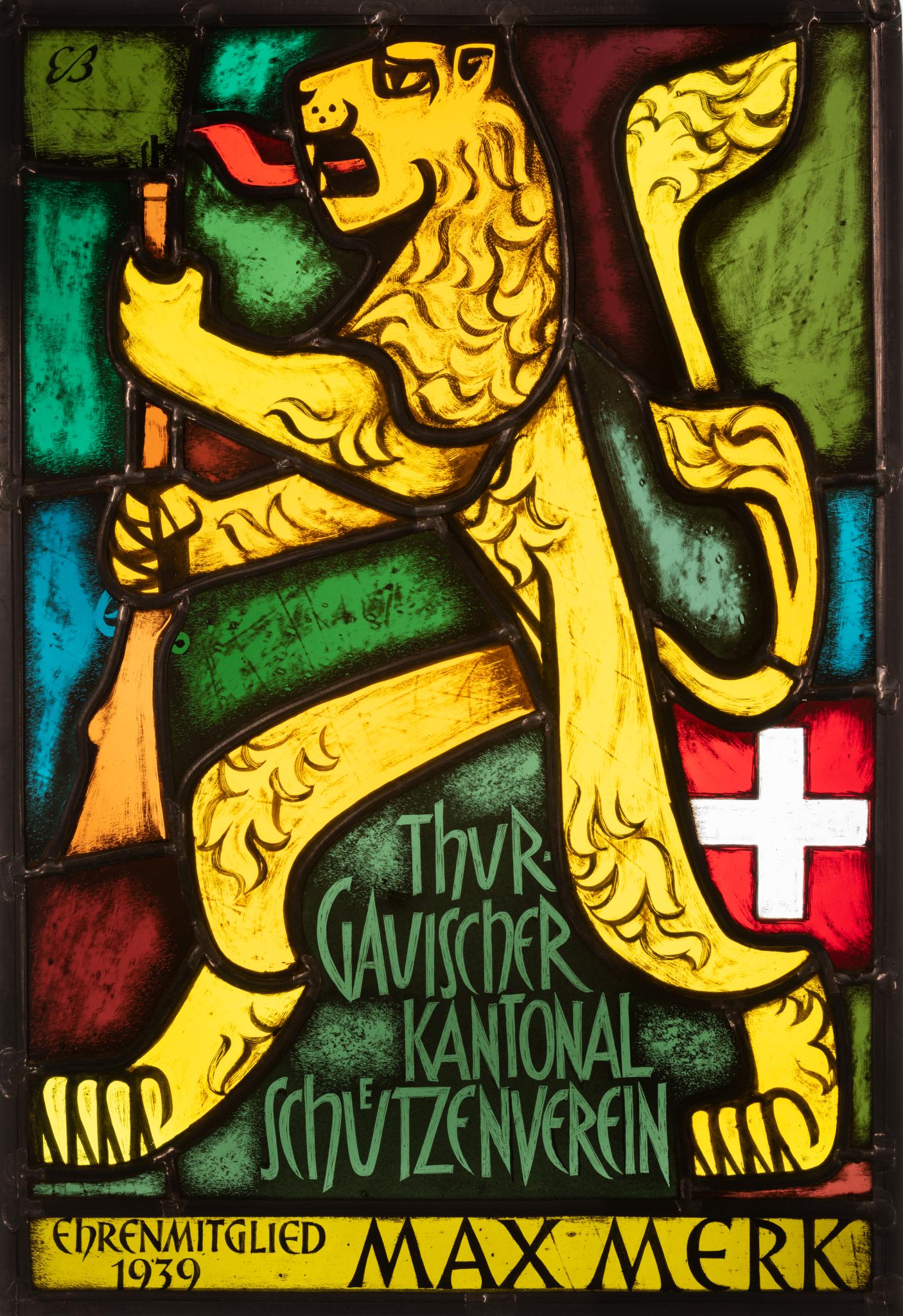 Wappenscheibe Thurgauischer Kantonalschützenverein für die Ehrenmitgliedschaft von Max Merk