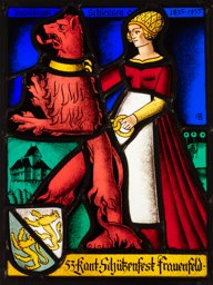 Wappen Frauenfeld: Ein steigender roter Löwe, von roter, gelbgezierter Frau an gelber Kette gehalten. Wappen Thurgau: Schräg geteilt von Silber und Grün mit zwei goldenen Löwen.