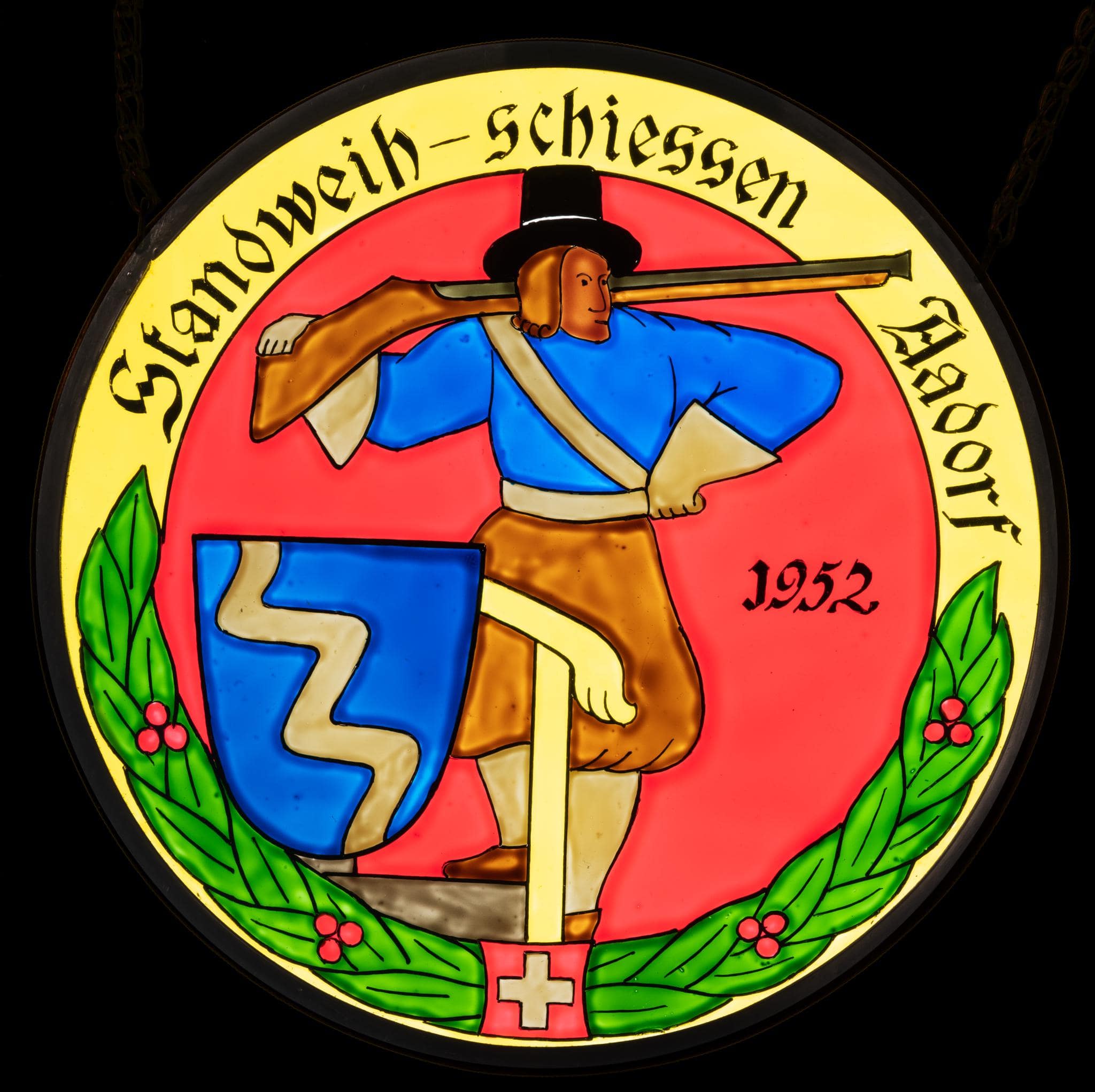 Die runde Monolith-Scheibe zeigt im mittleren Bildfeld einen stehenden Schützen mit einer Büchse über seiner rechten Schulter. Sein rechter Fuss ruht auf einer Treppenstufe, der Unterkörper ist teilweise vom Treppengeländer und dem Wappen von Aadorf verdeckt. Der Hintergrund des Bildfeldes ist rot, darauf ist das Jahr vermerkt. In der unteren Hälfte des gelben Randbereichs ist ein vegetabiler Halbkranz dargestellt. Im oberen Teil ist die Inschrift untergebracht.