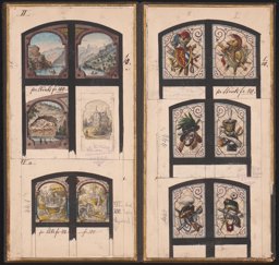Dargestellt sind auf dem Leporello-Prospekt Entwürfe von Glasgemälden im Massstab 1:10.