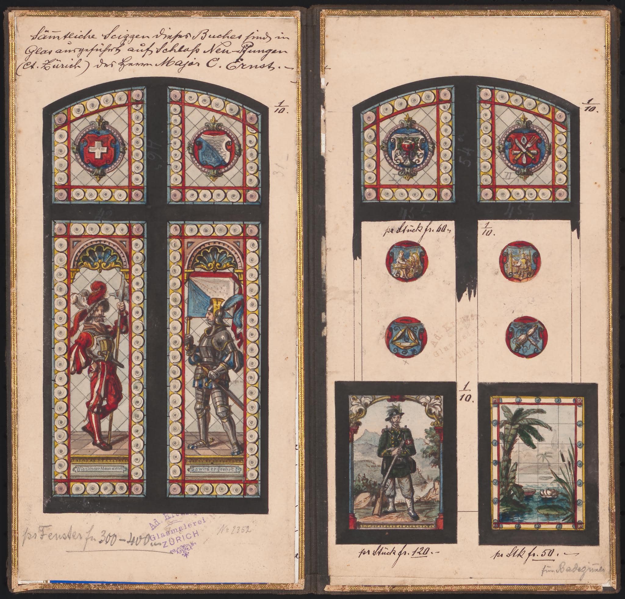 Seite 1: Sämtliche Skizzen dieses Buches sind in / Glas ausgeführt aufs Schloss Neu-Pfungen / (Ct. Zürich) des Herrn Major C. Ernst.