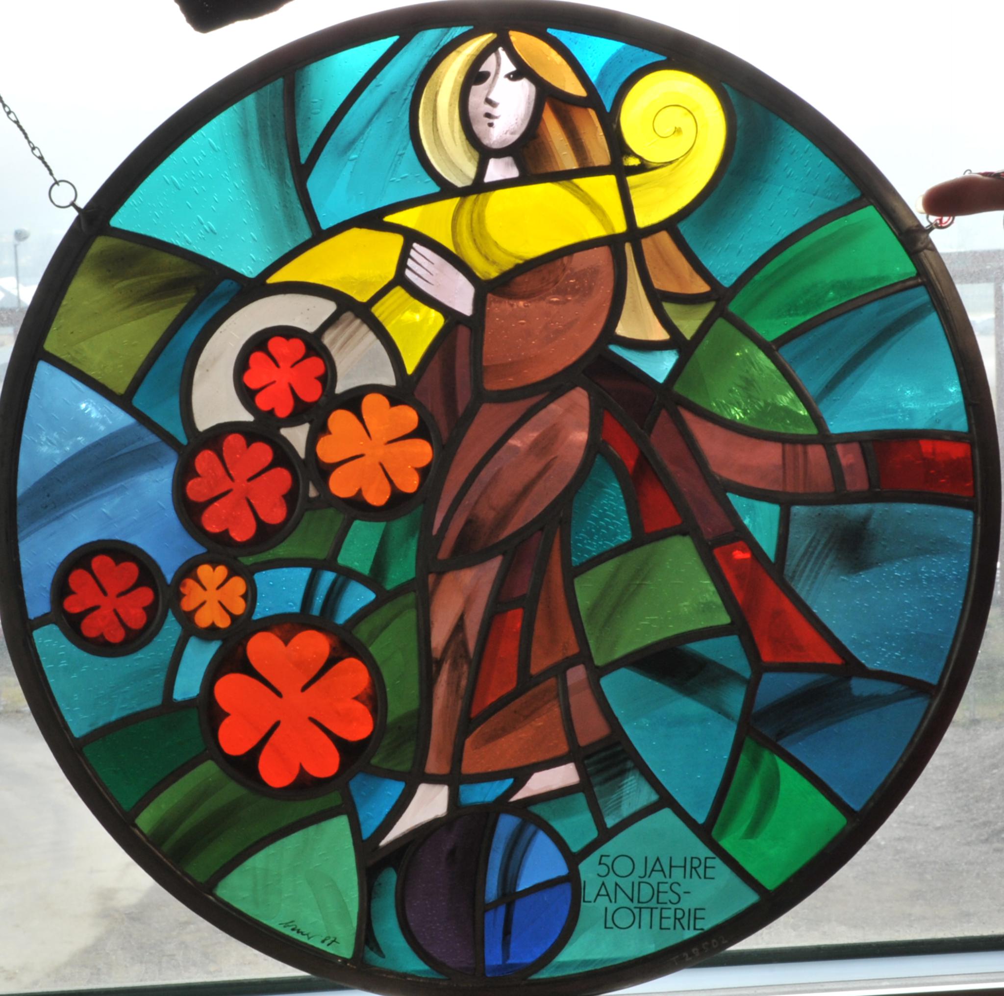 In der Mitte der runden Scheibe steht die Figur einer Frau auf einer blauen Lottokugel. Sie hat ein Füllhorn in der Hand, daraus fallen rote vierblättrige Kleeblätter heraus. Ein grün-blauer Hintergrund umgibt sie.