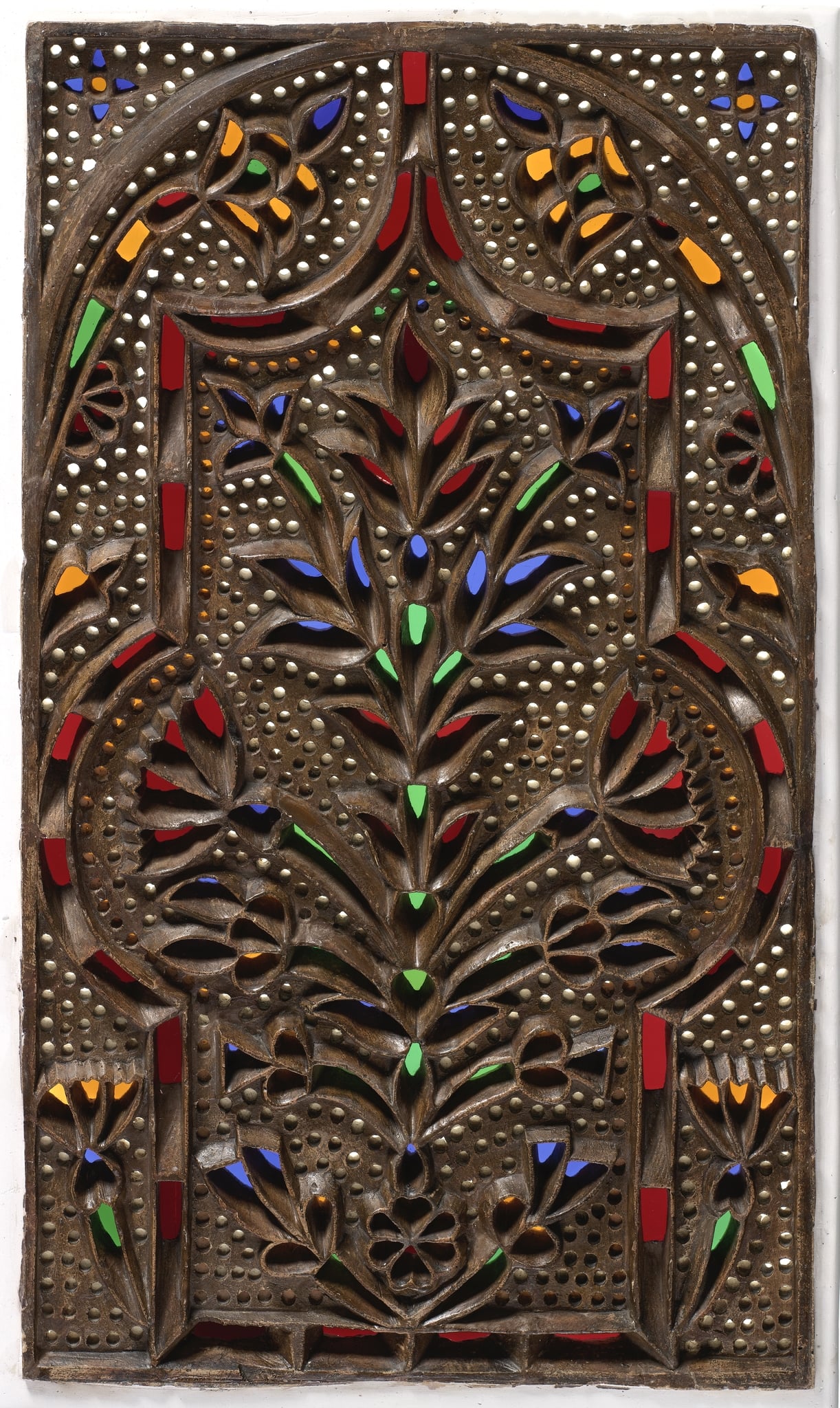 The quality of the execution of the stucco lattice and the precise depiction of the flowers demonstrate remarkable skill and craftsmanship. The colours and material properties of the glass and the latticework – although heavily restored – suggest that the window dates to the late 19th century. This assumption is supported by the results of an analytical study of glass from two stucco and glass windows from the Louvre collection (OA 7466/7, OA 7466/25) conducted by a team from the Musée du Louvre (Fellinger et al., 2022).
