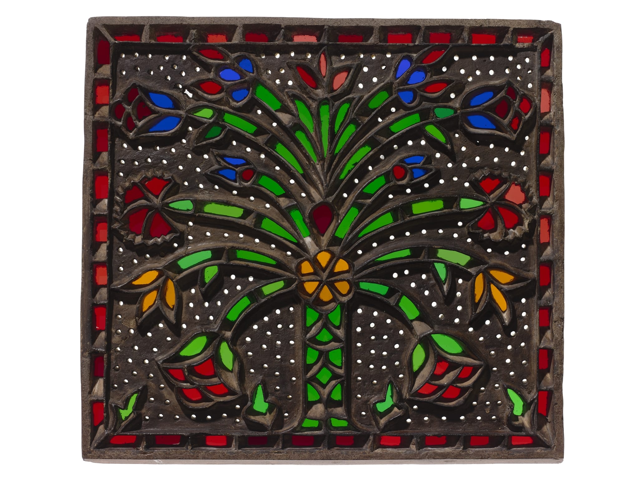 This stucco and glass window corresponds iconographically and technically to one of the standard types of qamariyya widespread in Egypt during the Ottoman period. The representation of the Tree of Life has a long tradition across time and cultures and can also be found in the Islamic world, where the tree that flourishes in paradise, called ṣidrat al-muntahā or ṭūbā, alludes to the Tree of Immortality described in the Qurʾan (20:120). Representations in various media, including ceramics, textiles, mosaics, murals, and stone or wood carvings, emphasize the widespread use of the motif in the Islamic realm.