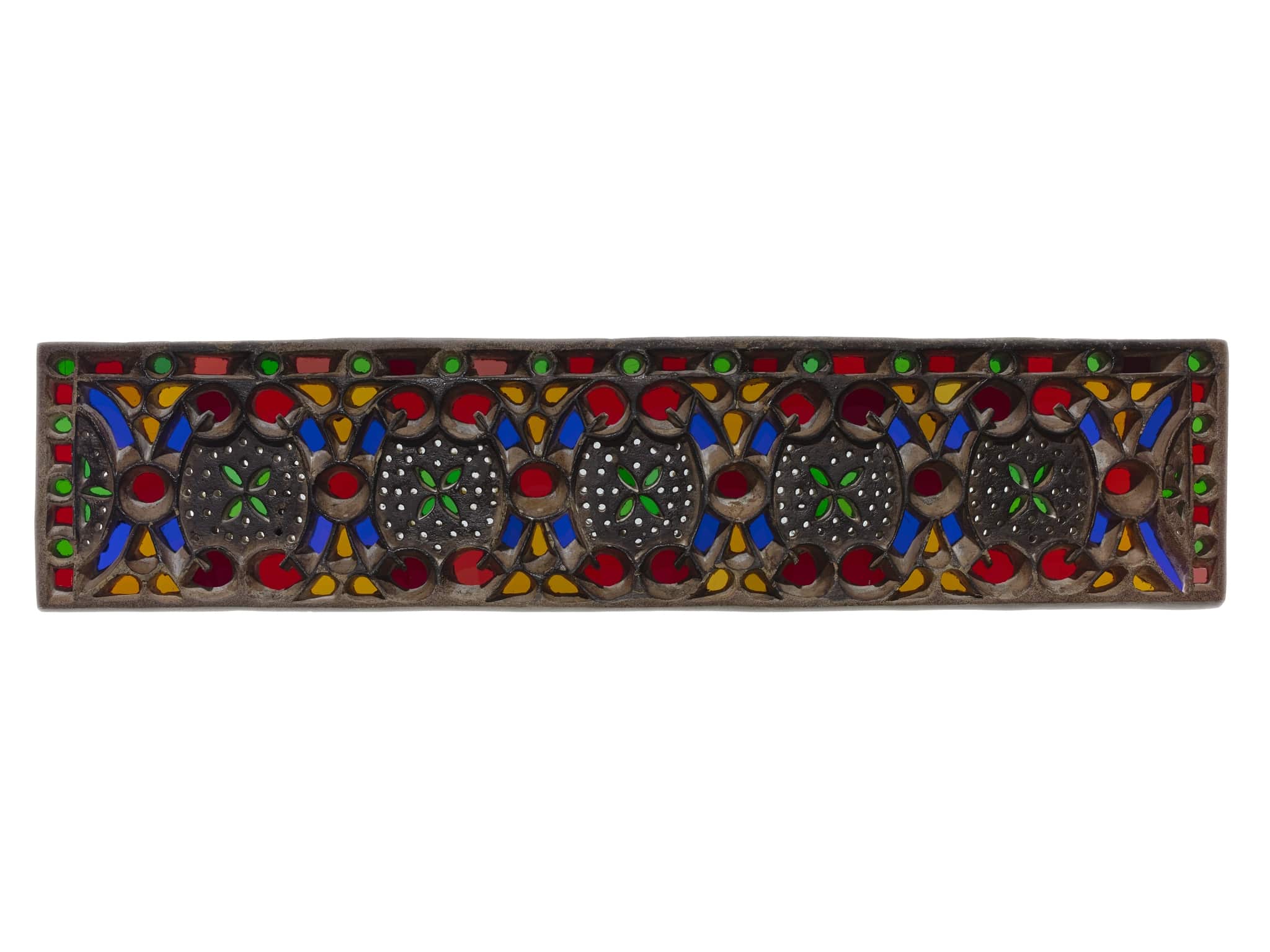Oblong stucco and glass window with floral ornamentation that is surrounded on three sides by a bi-colour frame in green and red. Six pairs of alternating concave and convex curlicues are arranged in a line. Every pair of curlicues encloses a four-petalled flower in green. The flowers are surrounded by a perforated background, which is slightly recessed. An ornament formed of three orange leaves flanks the curlicues on both sides.