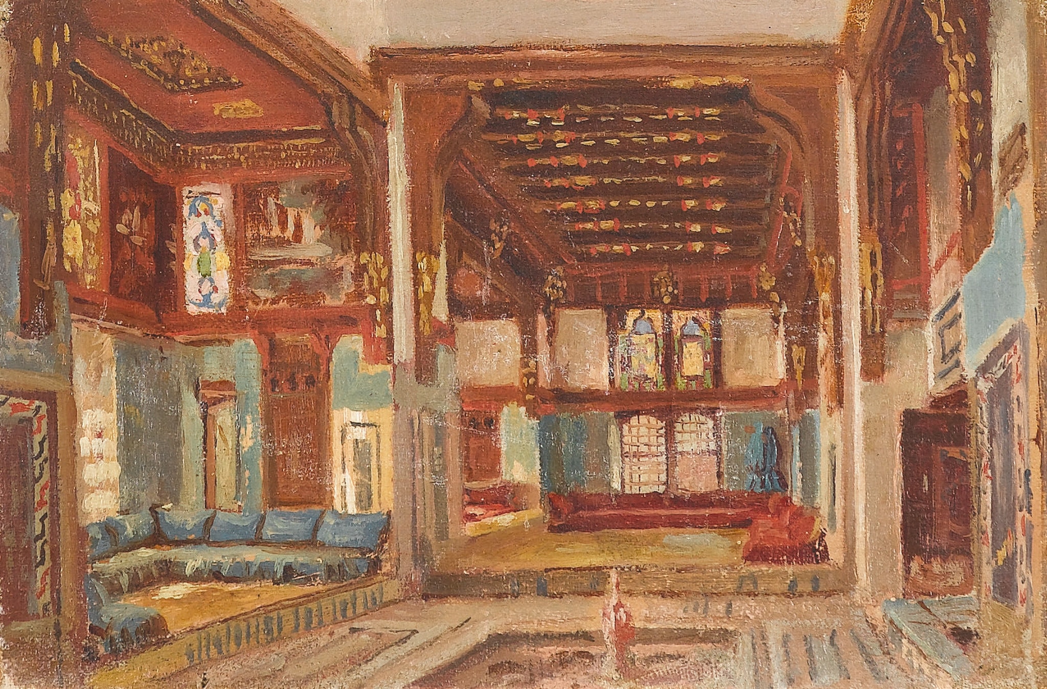 The Swiss painter Rudolf Durheim (1811–1895) had travelled to Cairo in 1848 and probably remained there for several years. In these years he painted besides general views of Cairo and its buildings and landscapes, also the interior of the house of Sheikh al-ʿAbbasi al-Mahdi (IG_49, IG_60). The so-called ‘House of the Mufti’ refers to a qāʿa (reception room) of a residence in Cairo owned by the grand mufti of Egypt, Sheikh Muhammad al-ʿAbbasi al-Mahdi (1827–1897) between 1847 and 1886. The qāʿa was installed by 1704/1705 at the latest, as indicated by an inscription recording the year 1116 AH / 1704/5 CE formerly on a column there (Herz, 1913, 120). The room was located on the ground floor, measured 10 × 31m, and was flanked on each side by three niches. The ‘House of the Mufti’ became a popular painting subject for artists travelling to Egypt during the 19th century. James Wild (1814–1892) had painted it in 1847, Theodor Zeerleder (1820–1868) in 1848, and Durheim in 1848–1849. The slightly younger architect Zeerleder was like Durheim from Berne, but, as far as it is known, they did not know each other.