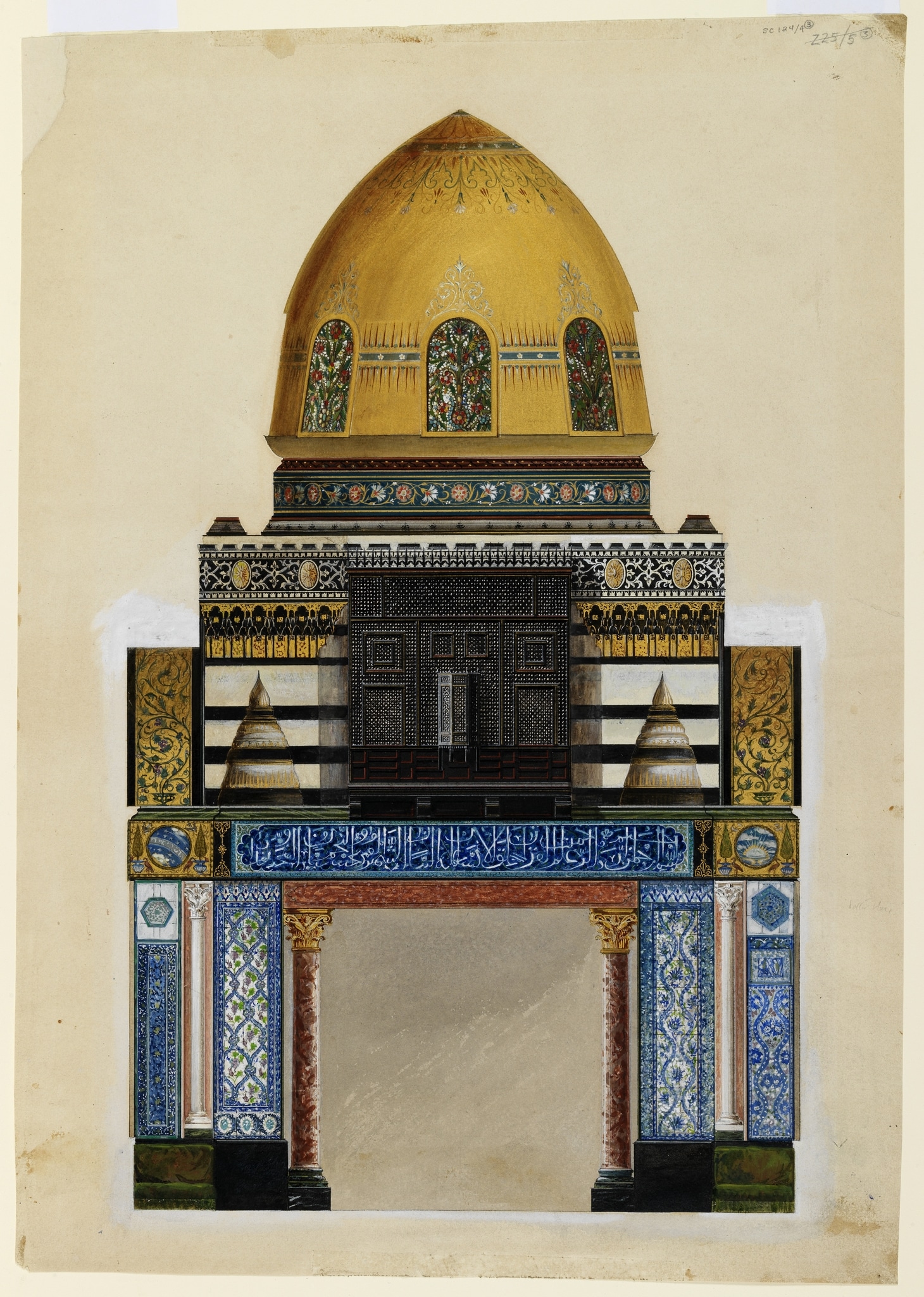Work on the Arab Hall extension began in 1877 and continued until 1881. At the Royal Institute of British Architects (RIBA), various drawings by Aitchison of the Arab Hall are conserved (IG_50–53). This presentation drawing was exhibited together with IG_52, which shows the elevation of the west wall of the Arab Hall, at the Royal Academy in 1880. According to an anonymous report on Leighton House and the Arab Hall, published on 1 October 1880 in The Building News, the exhibited drawings by Aitchison showed ‘the decorations as completed’ (Anon., 1880, p. 384).