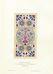 With regard to the technique, he describes and illustrates (IG_164, fig. 79) how the pieces of coloured glass were attached by means of ‘Gypswürstchen’ (strips of plaster) on the reverse of the plate (Franz, 1896, pp. 67–68). This method was also described by Max Herz (1895, p. 8; see IG_160) as the older of two techniques for producing stucco and glass windows. Furthermore, a photograph newly added for the second edition shows a stucco glass window with a pattern of curlicues and flowers. The same window appears on one of Beniamino Facchinelli’s photographs (IG_205) of the collection of the Museum of Islamic Art in Cairo, which was still located in the Al-Hakim Mosque at the time. A window with identical design is preserved in The Metropolitan Museum in New York since 1893 (IG_169).