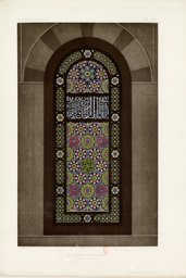 The three stucco and glass windows illustrated by Melchior de Vogüé were previously in the octagon of the Dome of the Rock in Jerusalem. The qamariyya depicted here was formerly in window 3 of the octagon. It bears a line of the second Sura: [there is no God but He, the Most Merciful, the Most Compassionate: Sura II,163–64].
