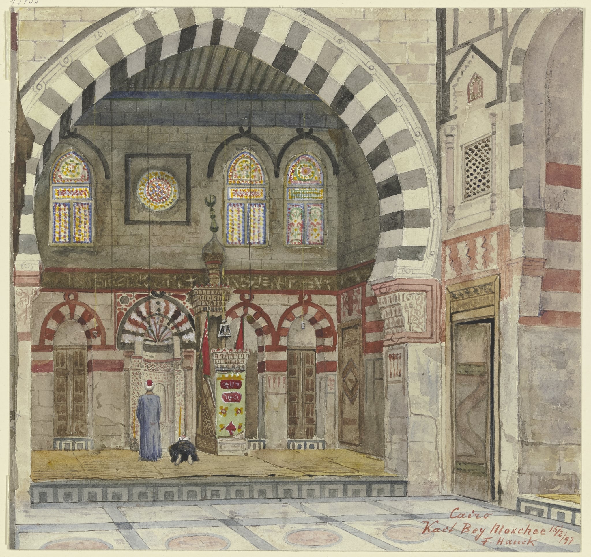 This watercolour by the German Orientalist painter Fritz Hauck (1852–1909) from 1897 shows the interior of the mosque in the funerary complex of Sultan al-Ashraf Qaytbay (877–79 AH / 1472–74 AD), with one circular and three pointed-arch stucco and glass windows in the mihrab wall: the circular window above the mihrab is flanked by one pointed-arch window on the left and two pointed-arch windows on the right. The windows appear to have predominantly geometric motifs, indicated by coloured dots in red, blue, yellow, and green. Vegetal decoration with stylized flowers can be identified in the two lower sections of the window on the right-hand side. The watercolour is signed, dated, and inscribed in the lower right-hand area with a brush, in red.