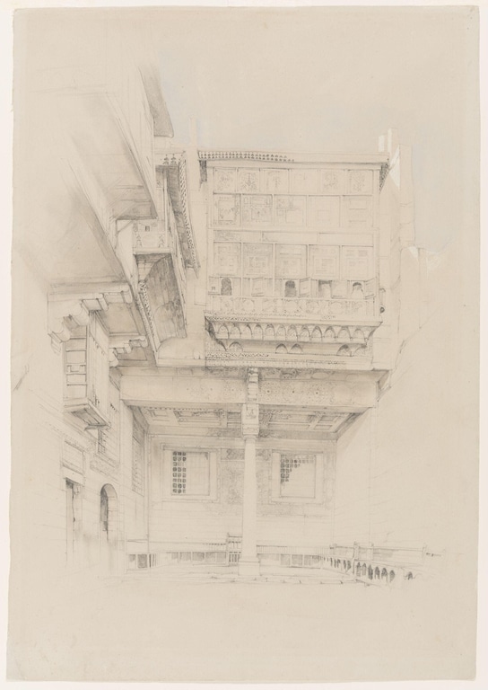 The line and wash drawing Courtyard of the Painter’s House, Cairo by John Frederick Lewis (1804–1876) was executed around 1843. It depicts a traditional Cairene house from the outside. Lewis drew the architectural details of the courtyard, such as the mashrabiyya and the stucco and glass windows, with great precision.