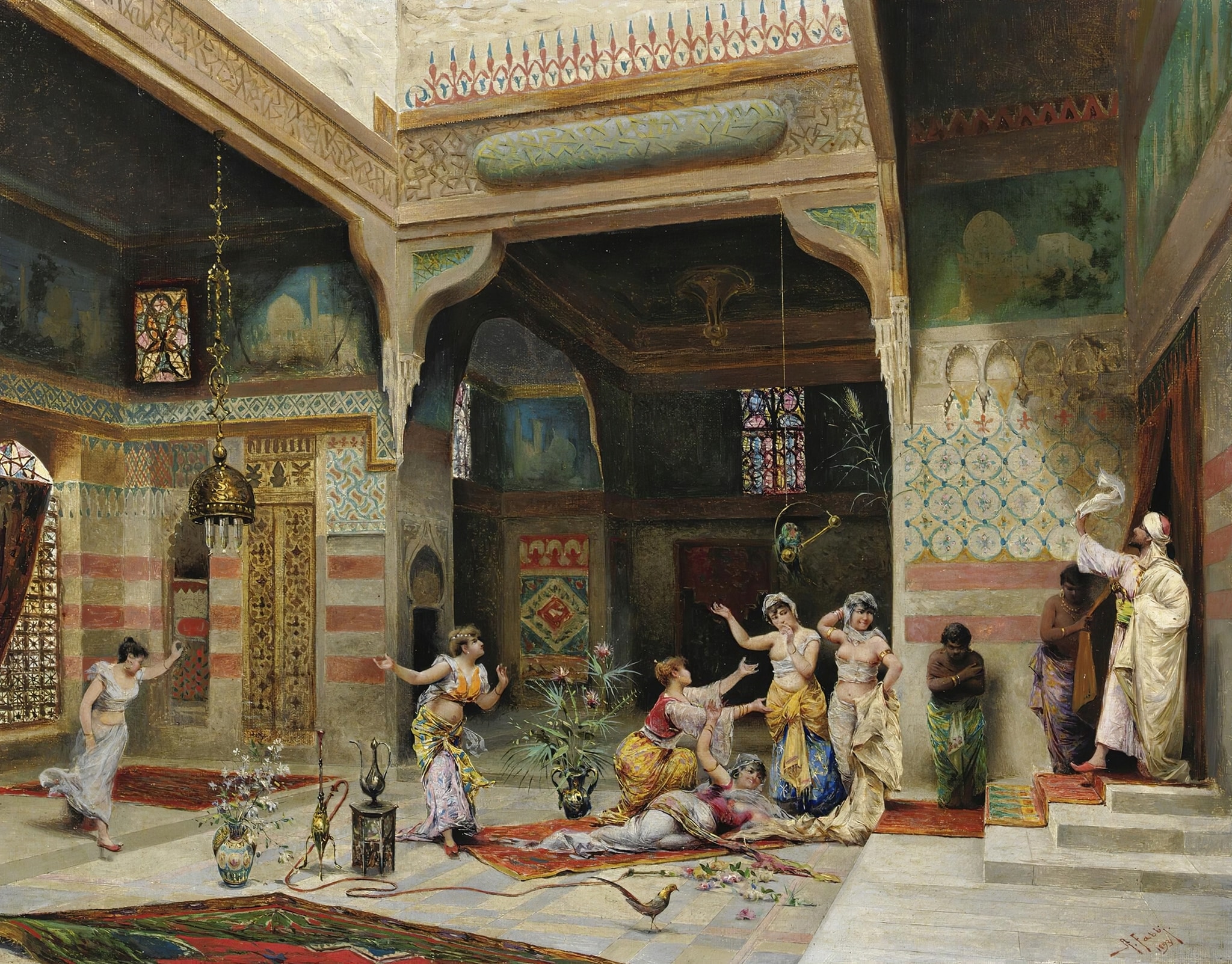 The Bologna-born Orientalist painter Alberto Fabbi (1858–1906) included stucco and glass windows in his oil painting Odalisques. He depicted a so-called ‘harem scene’, in which, a man on the right-hand side is welcomed by a group of women in a richly decorated interior: intarsia marble, lattices, and ceramic tiles are visible in the lower zone of the wall, while the upper section of the wall features murals with architectural views and multi-coloured stucco and glass windows with various forms of geometric ornament. There are two identical windows in the central recess and another shown in part to the left of it. Another geometric window in the left recess is depicted next to a mural painting with architectural motifs.