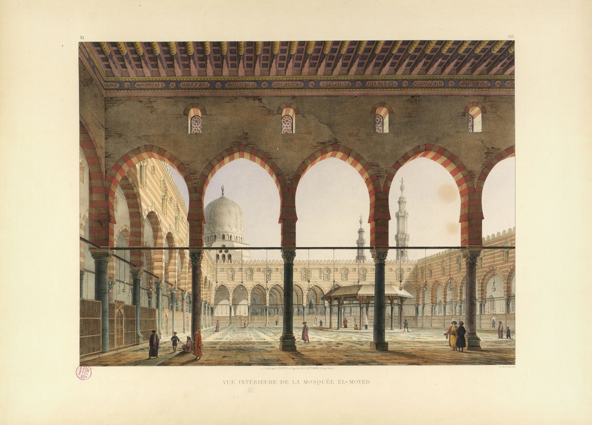 Pascal Coste’s plates are based on the extensive documentation he made in Cairo between 1818 and 1827. The Sultan al-Muʾayyad Shaykh Mosque (818–24 AH / 1415–21 CE) was the first one to be documented by the French architect, and more than 30 drawings, made in 1822, of the complex are preserved (Volait, 1998, p. [3]). One drawing shows the stucco and glass windows of the qibla wall (IG_223) and one shows a detail of the here depicted windows of the courtyard (Marseille, Bibliothèque de l’Alcazar, MS1310_f12b).