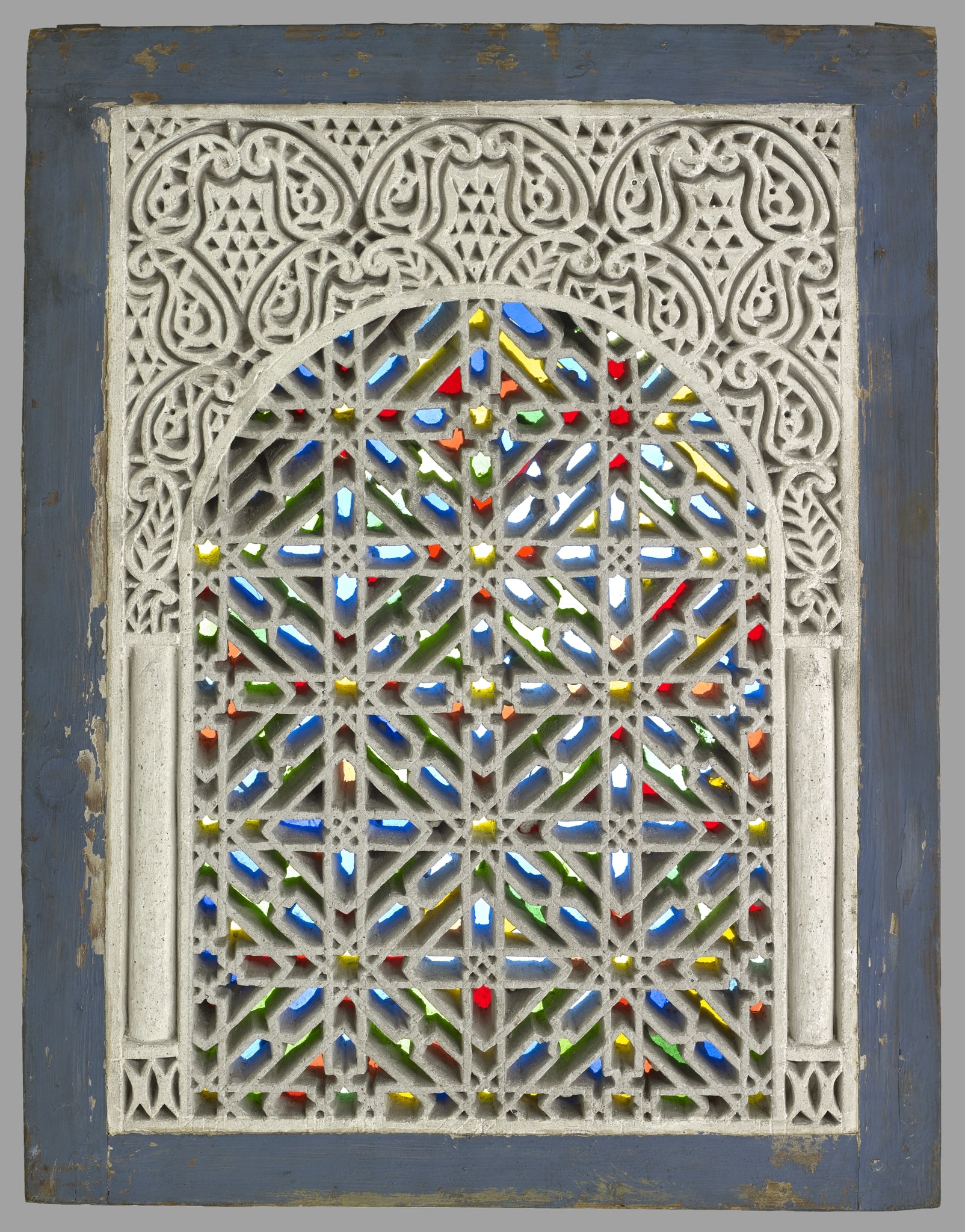 Latticework carved into a rectangular stucco panel and inlaid with colourless and coloured pieces of glass.
