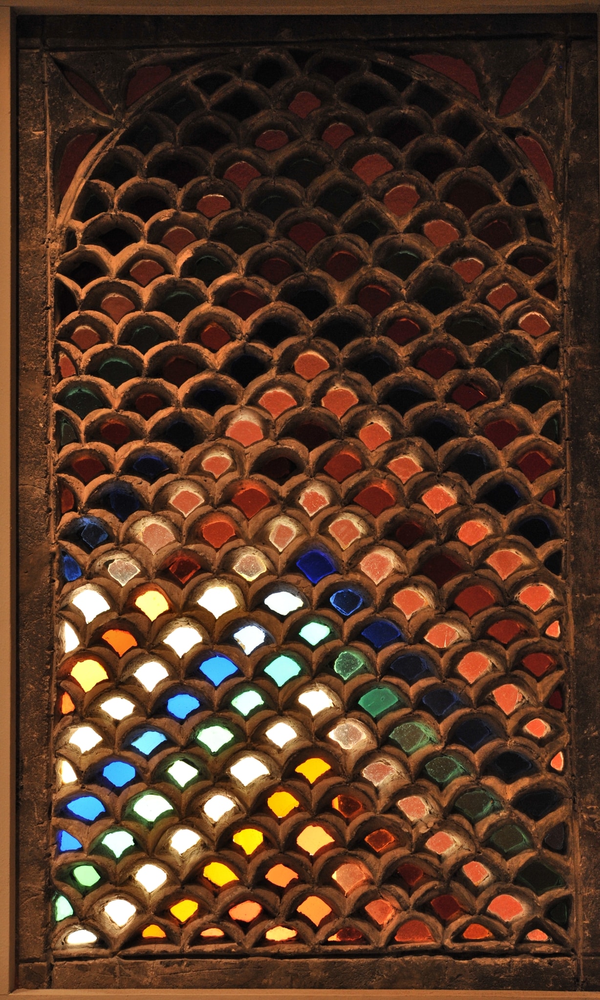 The latticework was carved into a rectangular stucco panel with a porous surface and inlaid with colourless and coloured sheet. The pieces of glass are fixed onto the back with a thin layer of gypsum plaster.