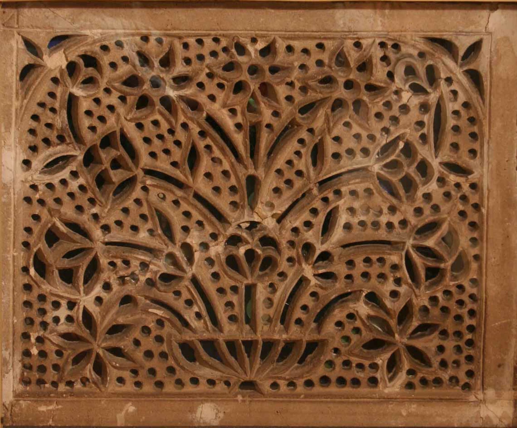 The design of the latticework has two levels. The main motif (level 0) has been carved out of the stucco panel with sharp, knife-like tools following a template incised in the surface of the panel. Traces of the incisions are still visible in some places on the front. The second level (level –1), which lies 6–10mm below level 0, consists of regularly spaced perforations. The holes were pierced with a metal or wooden pin in the stucco before it was fully set. They are c.12mm in diameter and are slightly tapered towards the back. The distance between the holes is 4–9mm. All holes are backed with colourless glass. The main design and the perforations have been worked in such a way that the incident light is directed downwards into the room.