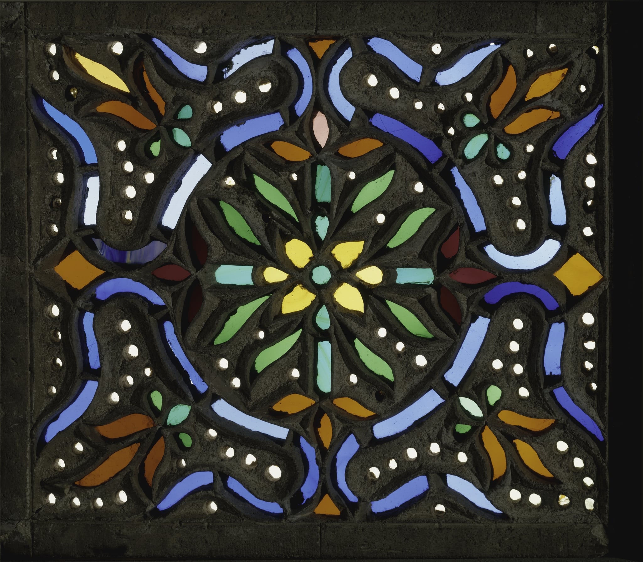 Ornamental stucco and glass windows of this type were widespread in the Ottoman period. Usually, these windows show a strictly symmetrical design, with the centre of the panel being occupied by the main motif, which can be a star or a flower. In the collections studied, the star predominates over the flower motif (see for instance LG_166 (lower part), IG_350 (lower part), IG_353, IG_356 (upper part)).