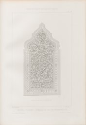 The text gives a historical overview of early Ottoman Bursa and its monuments, and the origins and methods of Turkish art (‘l’art turc’), as well as its principles of layout and use of colour. In the illustration section, most of the figures are connected to the Yeşil Cami (Green Mosque) and the Yeşil Türbe (Green Tomb). Out of 48 pages in the illustration section, 41 are dedicated to architectural décor, while the other 7 pages show interior or exterior views, elevations, and ground plans. The figures include two full-page illustrations of stucco and glass windows, yet Parvillée does not mention them in the text.