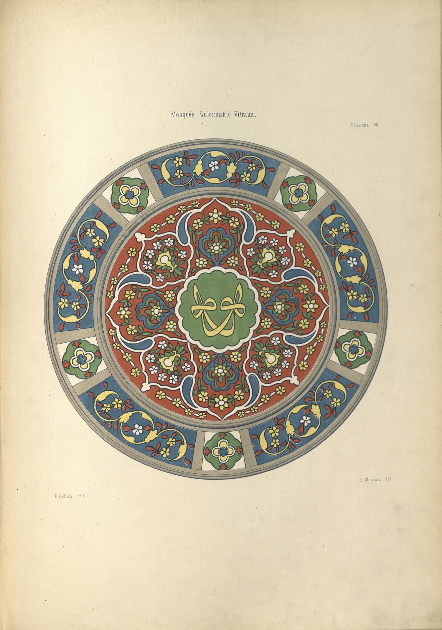 Pl. VII is a colour print based on a drawing by Pietro Montani that accompanies the chapter on the Sülemaniye Camii (Süleymaniye Mosque) in Marie de Launay, Die Ottomanische Baukunst / L’Architecture ottomane / Uṣūl-i Miʿmāriyye-i ʿUsmaniyye, Istanbul: Imprimerie et lithographie centrales (1873).