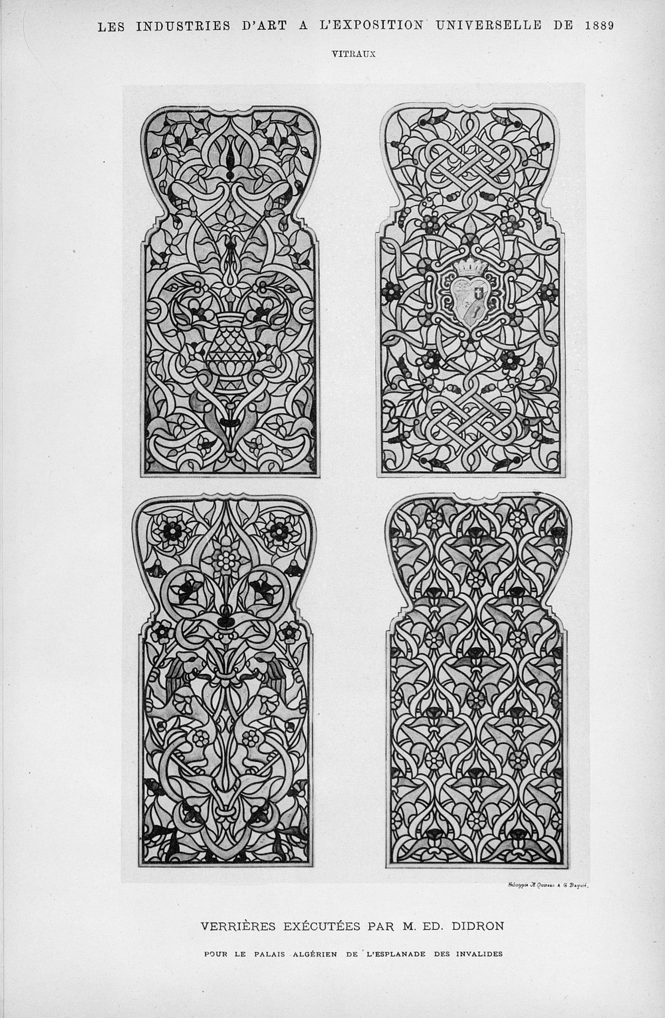 A book illustration in Victor Champier’s Les Industries d’art à l’Exposition Universelle de 1889 (Revue des Arts décoratifs) shows a black and white plate with four stained glass windows designed and executed by the French glass painter Edouard Didron (1836–1902) for the Algerian pavilion of the world’s fair of 1889 in Paris. In the previous volume of the Revue des Arts décoratifs 1889 (pp. 151–152), Didron wrote an article about the stained glass production of the last 100 years and its presentation at the world’s fair of 1889. He also comments on the windows he made for the Algerian pavilion: he explains that, having already worked as a stained glass artist for thirty-six years, he had attempted to produce stained glass without painting the glass. This was to lend decorative stained glass simplicity once more, as in earlier times: ‘pour attribuer au vitrail de décoration pure le caractère de simplicité dans les moyens mis en oeuvre qu’il dut avoir aux temps primitifs.’ He describes his method as follows: coloured, detailed foliage is set against a yellow or white background, such that the drawing only emerges through the lead cames. Didron created such windows, for example, for the ceiling of the salle publique of the Comptoir d’Escompte in Paris in 1880 and – ‘avec d’extraordinaires complications’ – for the Algerian pavilion. In his words, these were very colourful, on a white and yellow background, and in Arabic style. As far as is known, they did not survive.