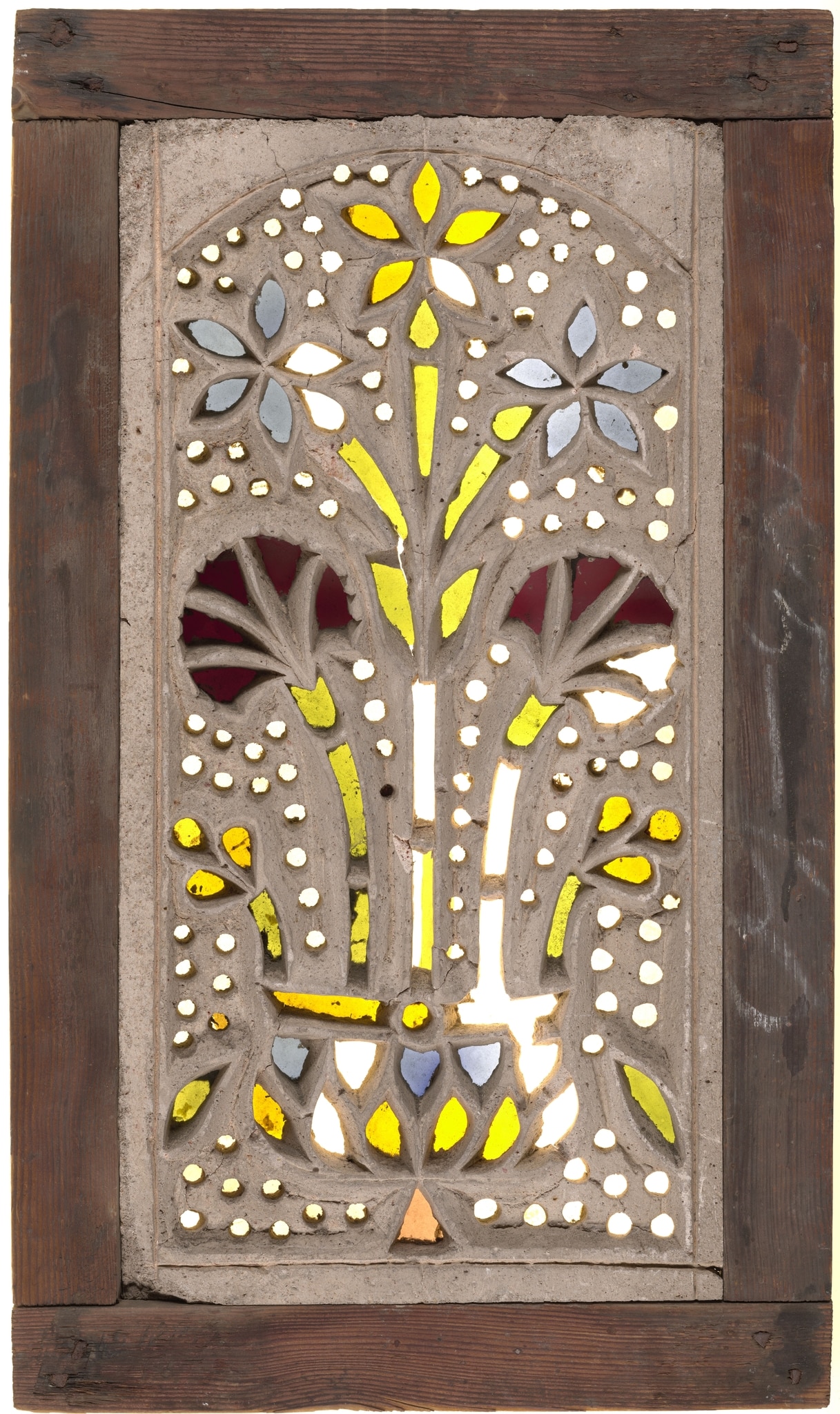 This stucco and glass window is preserved in its original frame. Apart from notable damage in the perforated background above the vase and a large crack in the top left area of the panel, the latticework only shows minor superficial losses. Several pieces of glass are missing (c.10%). Three pieces of glass show traces of paint.