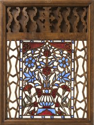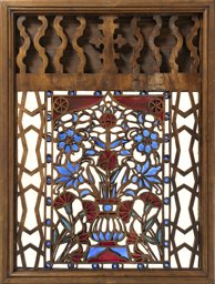 The three stucco and glass windows installed in this wooden mashrabiyya are replicas. Each consists of a stucco lattice and a panel of red flashed glass that was etched and then painted with silver stain and coloured enamels; the glass is loosely inserted into the frame behind the stucco lattice.