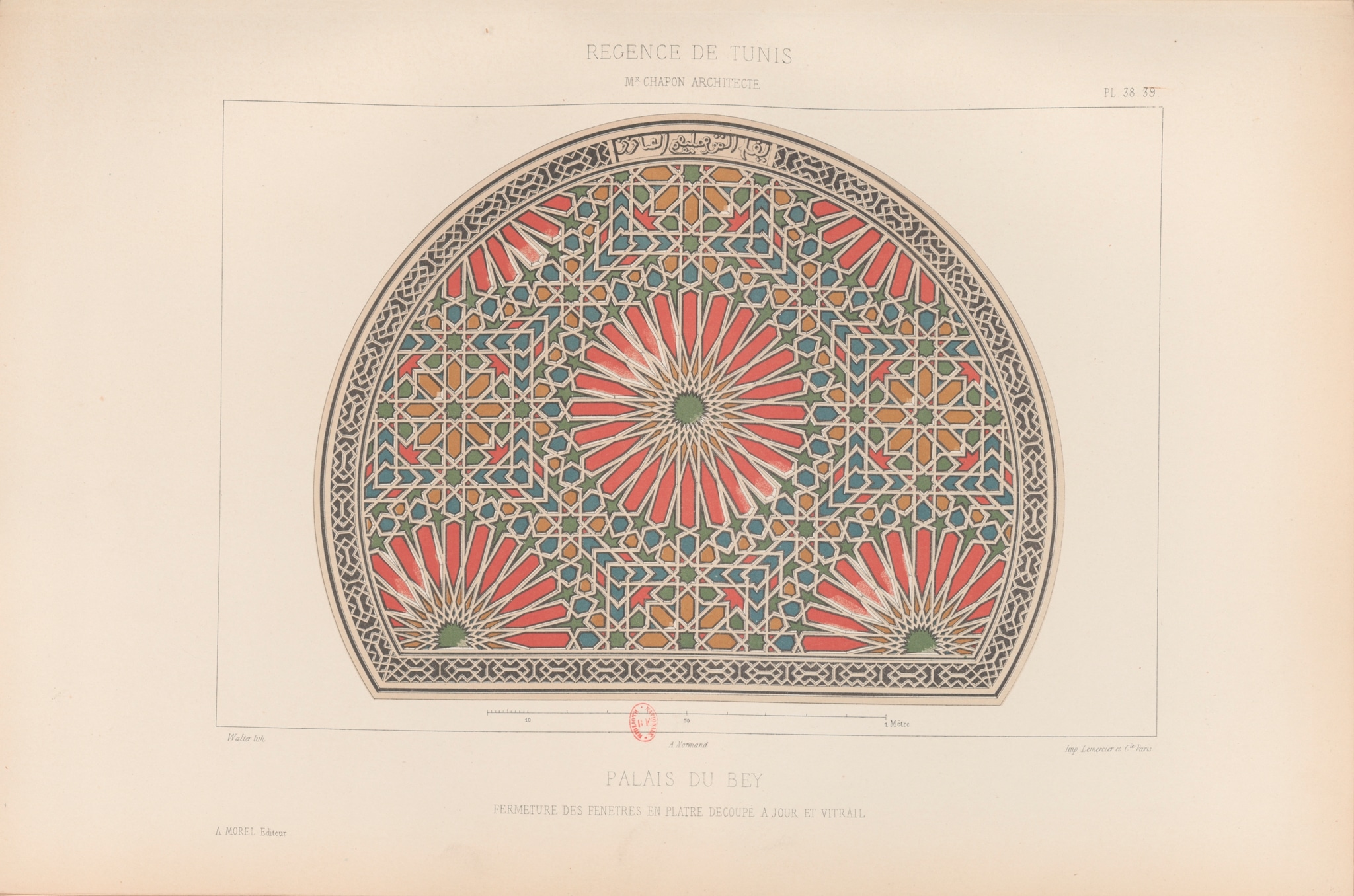 Pl. 38–39, a colour plate in Alfred Normand's L'architecture des nations étrangères. Études sur les principales constructions du parc à l’Exposition Universelle de Paris (1867), published in 1870 in Paris by A. Morel, éditeur-libraire, shows a lunette-shaped stucco and glass window of the Tunisian pavilion at the 1867 Exposition Universelle in Paris.