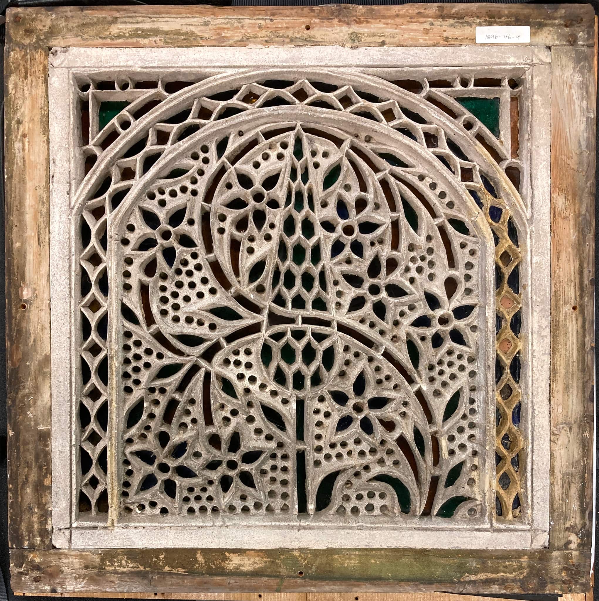 The window discussed here forms part of a lot of six qamariyyāt (IG_288–293) acquired by the Glasgow Museums in London in 1896 from the Pre-Raphaelite painter, writer, and collector Henry Wallis (1830–1916). Wallis was an expert in Islamic art and especially ceramics, as several of his publications attest (see for instance Wallis 1885, Wallis 1893, Wallis 1894, Wallis 1899). Due to the lack of documentation, it is not possible to clarify where Wallis acquired the windows. However, several formal and technical similarities suggest that at least four of the six windows were produced in the same workshop and possibly came from the same architectural context: IG_288 and IG_289 as well as IG_290 and IG_293 form a pair, with the same motif and almost identical dimensions. The window here shows the same, but mirror-inverted motif as IG_288. Moreover, both window pairs share the same decoration for the spandrels above the arch. Stylistic features and the manufacturing technique suggest that the windows were made in Egypt.
